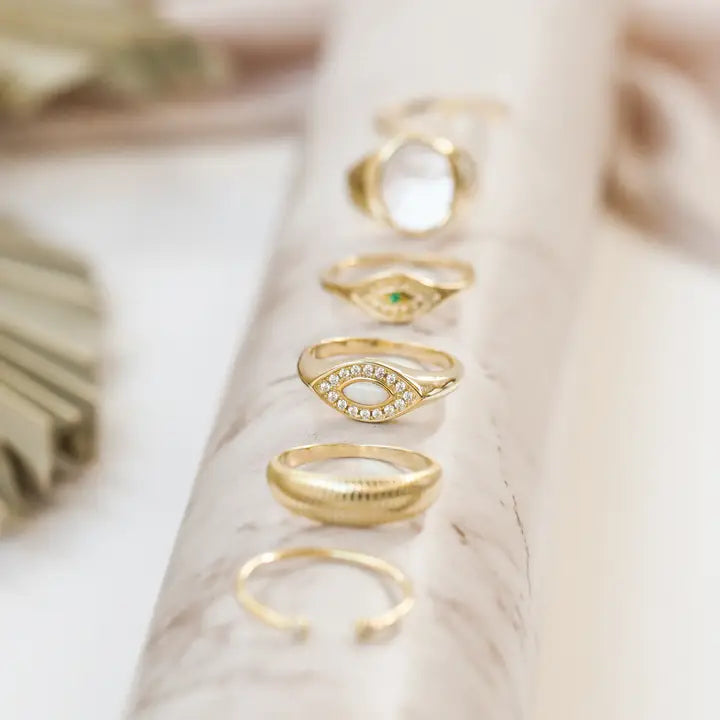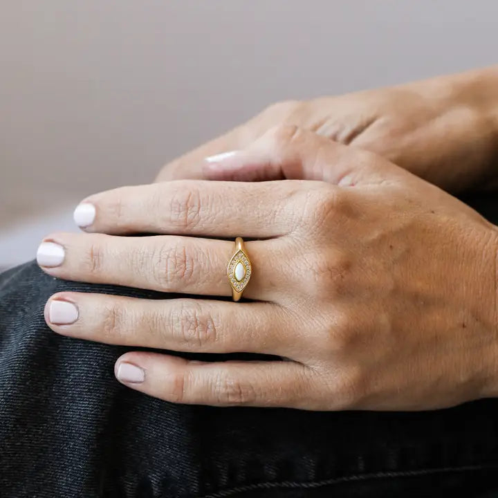A CZ encrusted evil eye guards against misfortune while bringing good luck to the wearer and a delicate drop of bright White Opal inspires happiness and creativity. We crafted our collection of rings to make every day a reminder of joy, self-love, and to shine from within!