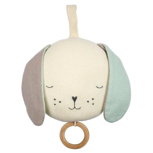 This knitted organic cotton musical dog toy is the perfect way to soothe a little one. Simply pull the smooth wooden ring to play the delightful tune. Beautifully crafted with charming embroidered features and adorable floppy ears.