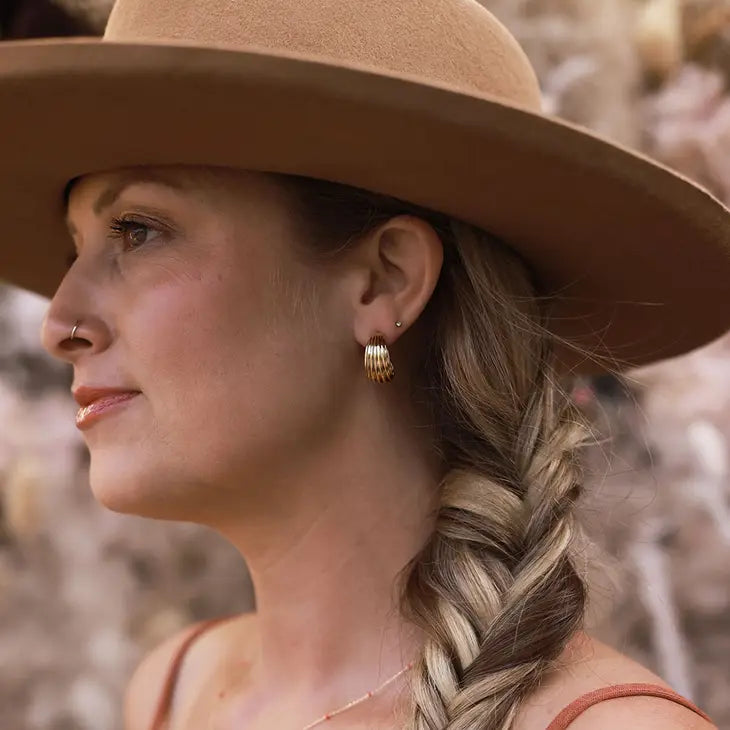 These versatile, everyday hoops are made with the original molds from the 70's. They have a ribbed pattern and hug the earlobe. They are high quality 14k gold plated brass or silver plated + coated to prevent tarnish. Surgical steel posts. Genuine American Vintage.