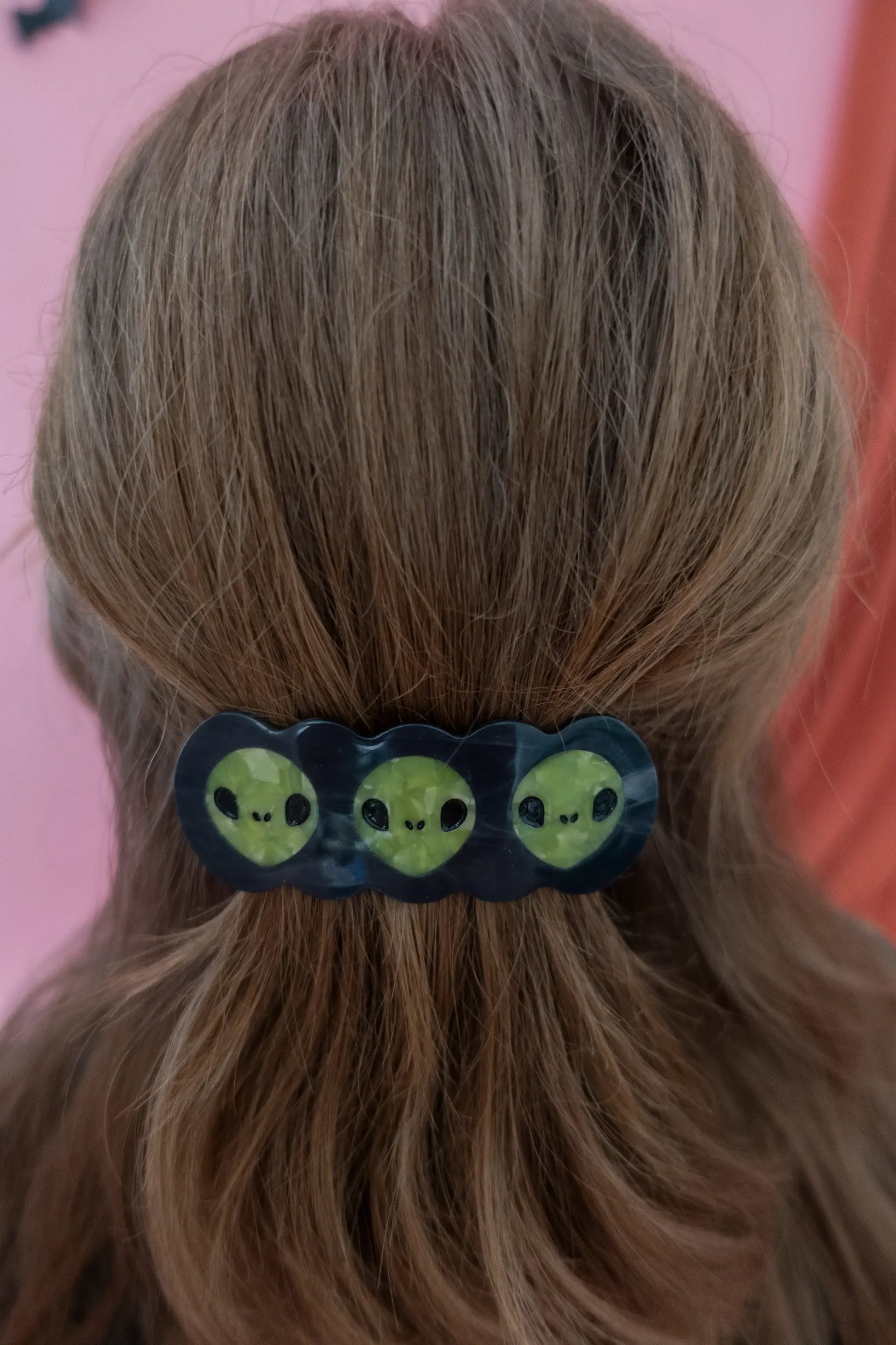 Cute little alien barrette made out of sturdy black acrylic with 3 little aliens on it.