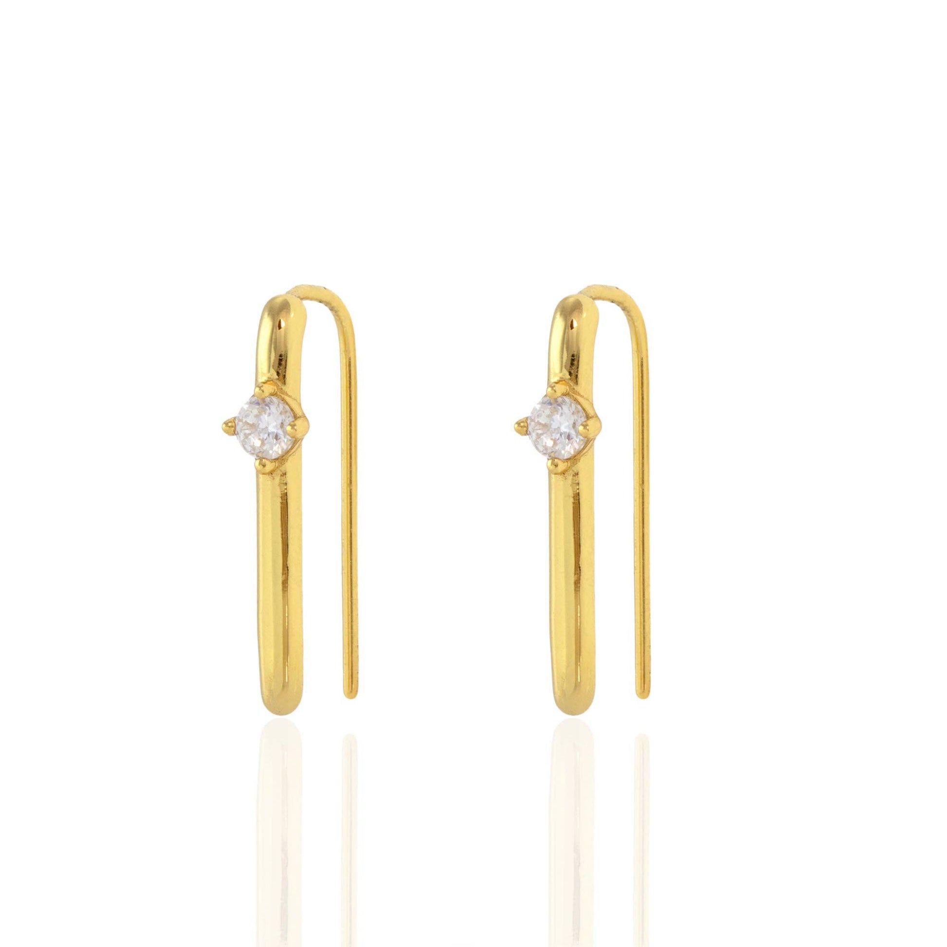 Arc style earring measures 19mm length. Available in solid sterling silver with 18K gold plating with a prong set cubic zirconia crystal. Packaged in our signature glass bottle.