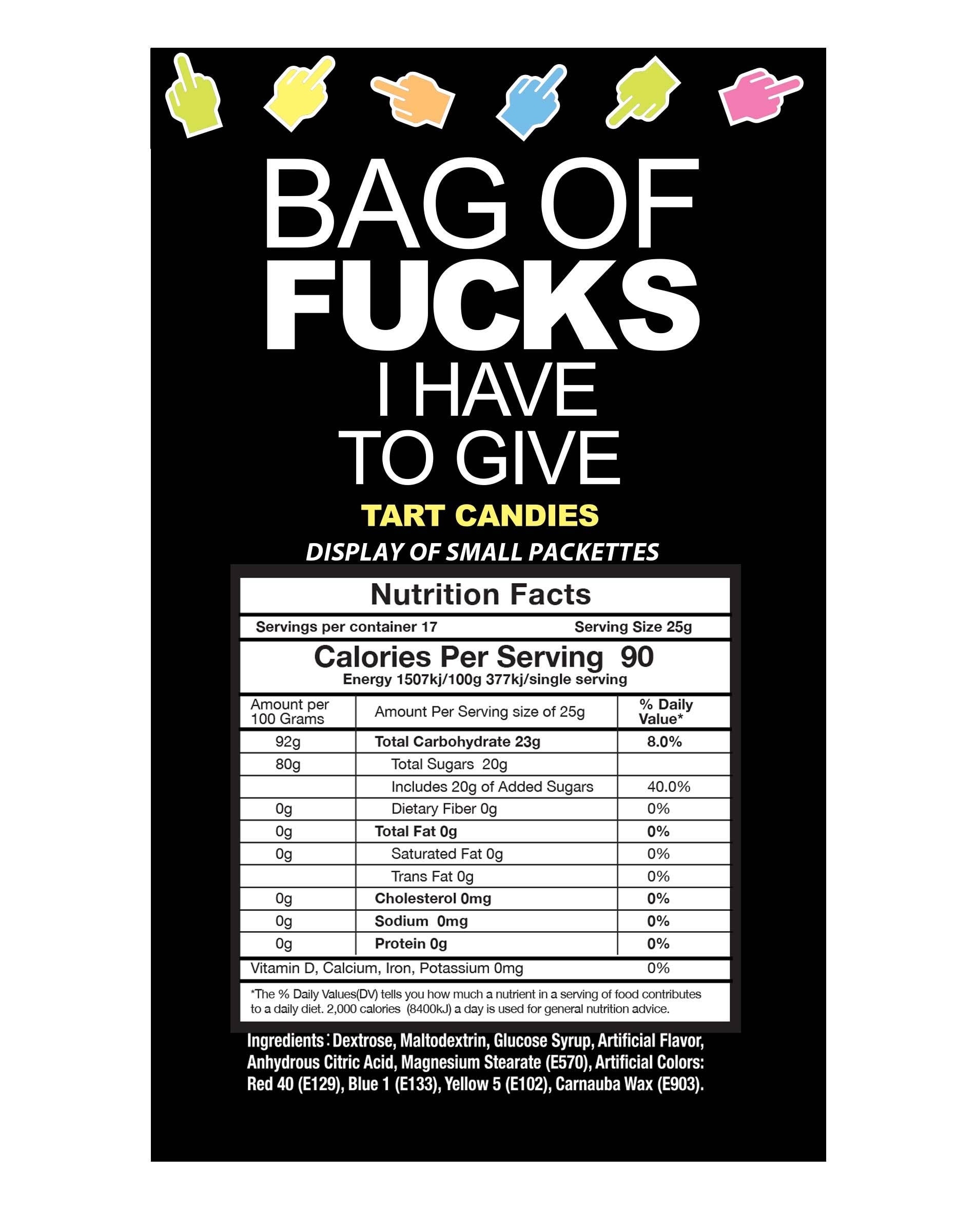 Introducing the Bag of Fucks I Have to Give candy because sometimes you just need a little humor to sweeten your day! Perfect for when you want to express how much you care—without saying a word. Whether treating yourself or gifting it to a friend who could use a laugh, this candy will surely be a conversation starter. Grab your Bag of Fucks I Have to Give today and savor the taste of not giving a damn!