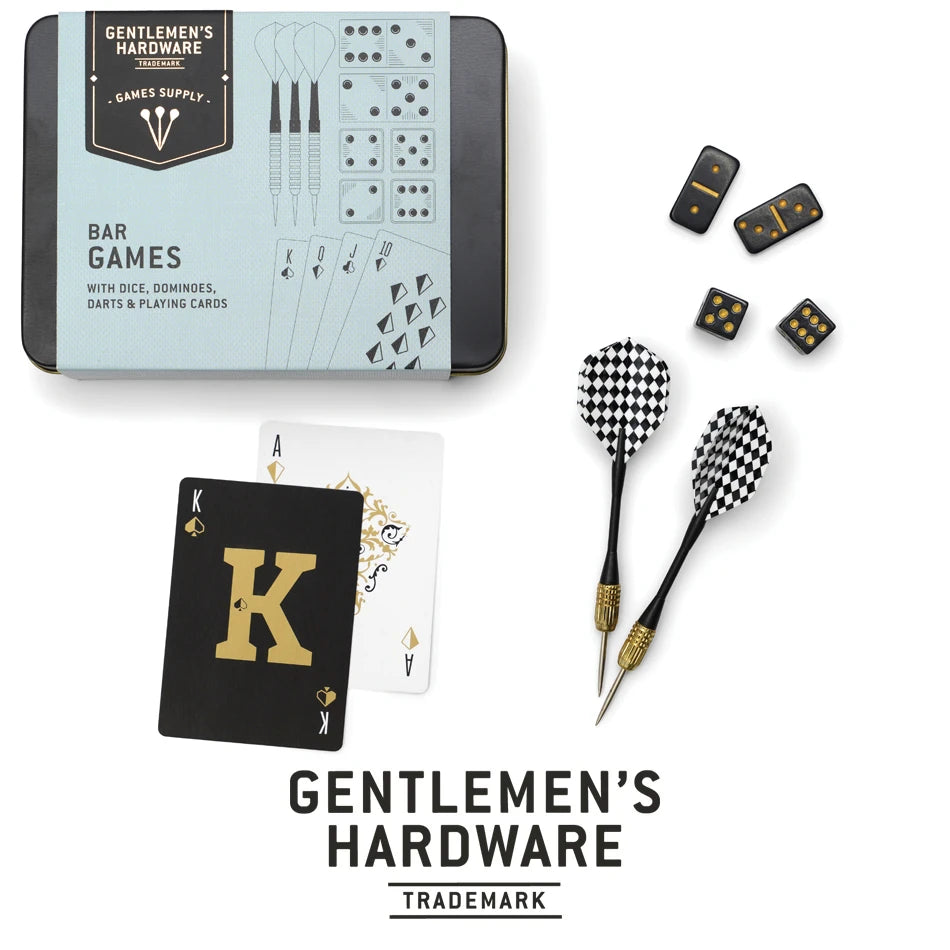 Combine classic bar games in one common box, for greater portability and more fun for everyone. Easy to pack and store, these bar games are perfect for playing on the go. The set includes vintage dice, dominoes, darts and playing cards for maximum fun wherever you are!Includes:26 domino tiles1 deck of cards6 dice3 dartsGame instructions• Box size: 15.5 x 11.5 x 11.5 cm