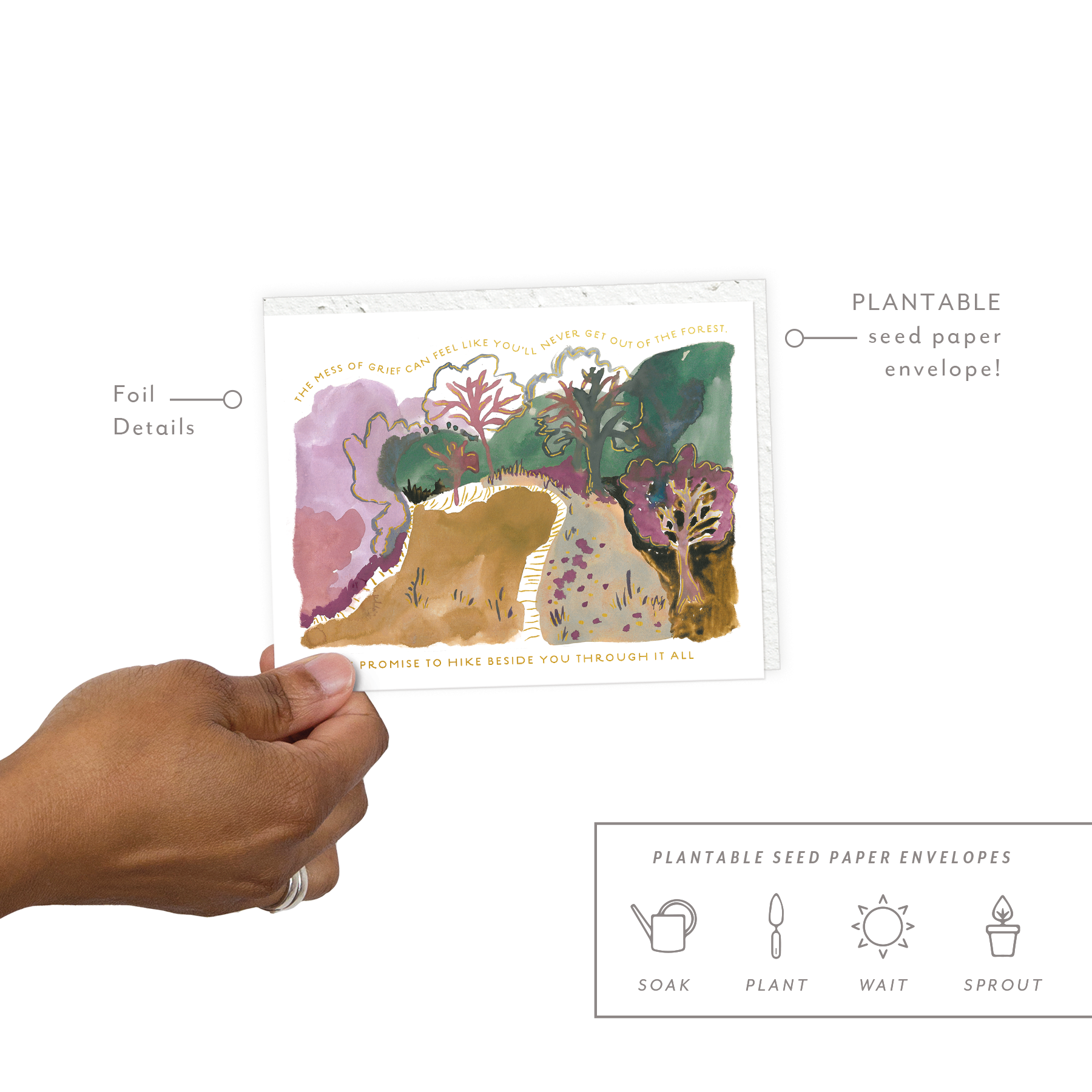 All Seedlings greeting cards have foil details and a PLANTABLE seed paper envelope which is embedded with wildflower seeds. This seed paper is made of a biodegradable eco-paper created with post-consumer materials - no trees harmed for this paper! When planted, our envelopes compost away leaving only flowers behind. Blank inside, our cards are printed on premium paper and are all accented with foil details. All Seedlings cards are made in the U.S.A. Need a display? Order BOUDIS48 for a 48 pocket spinner or BOUDIS24 for our 24 pocket spinner. All of our cards are also available with NO cello. Message us if you want your cards naked! Card size: 4.25" x 5.5" Env: 4.3125" x 5.75" (A2)