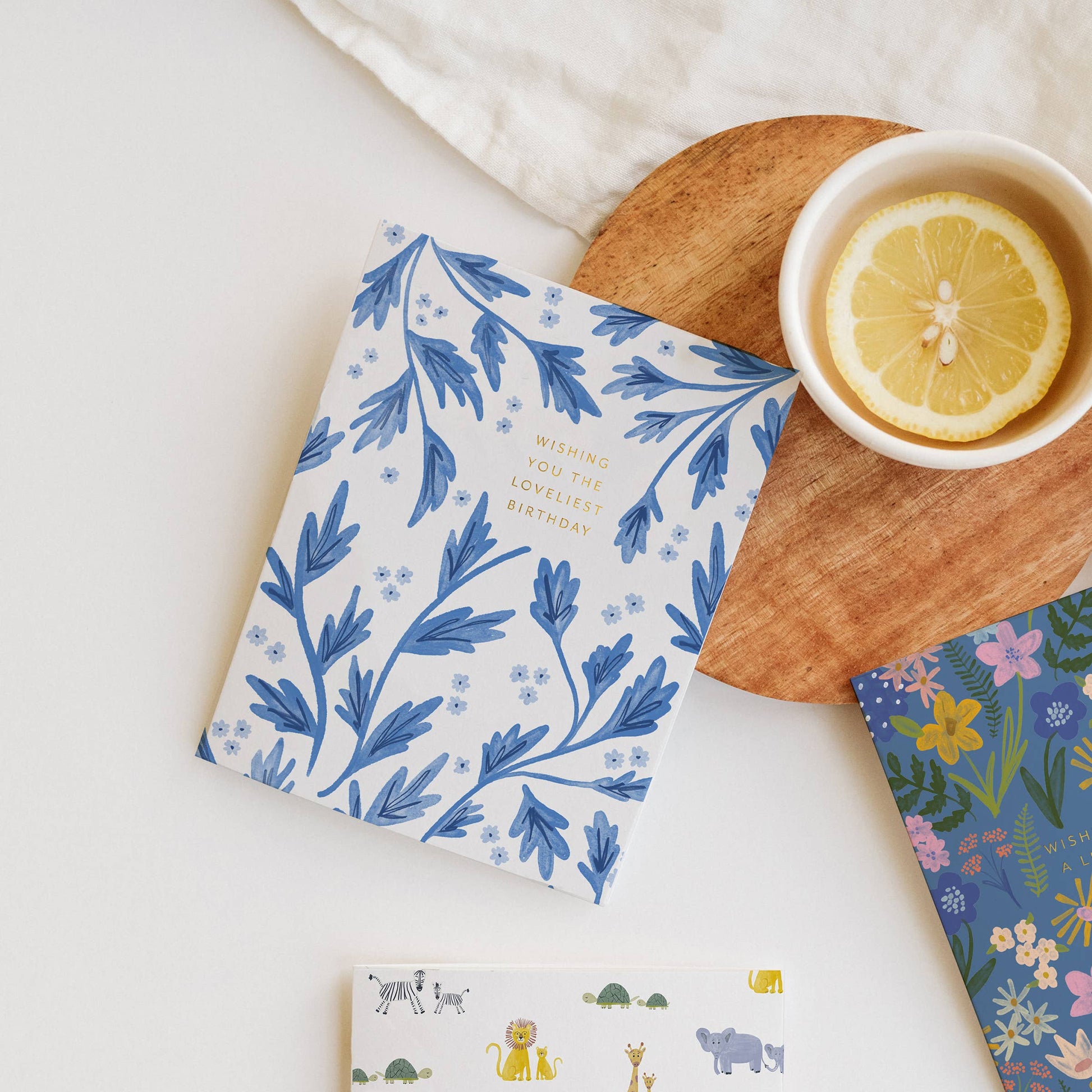 Wish the loveliest birthday with this delicate blue vine illustration paired with a gold foil message.