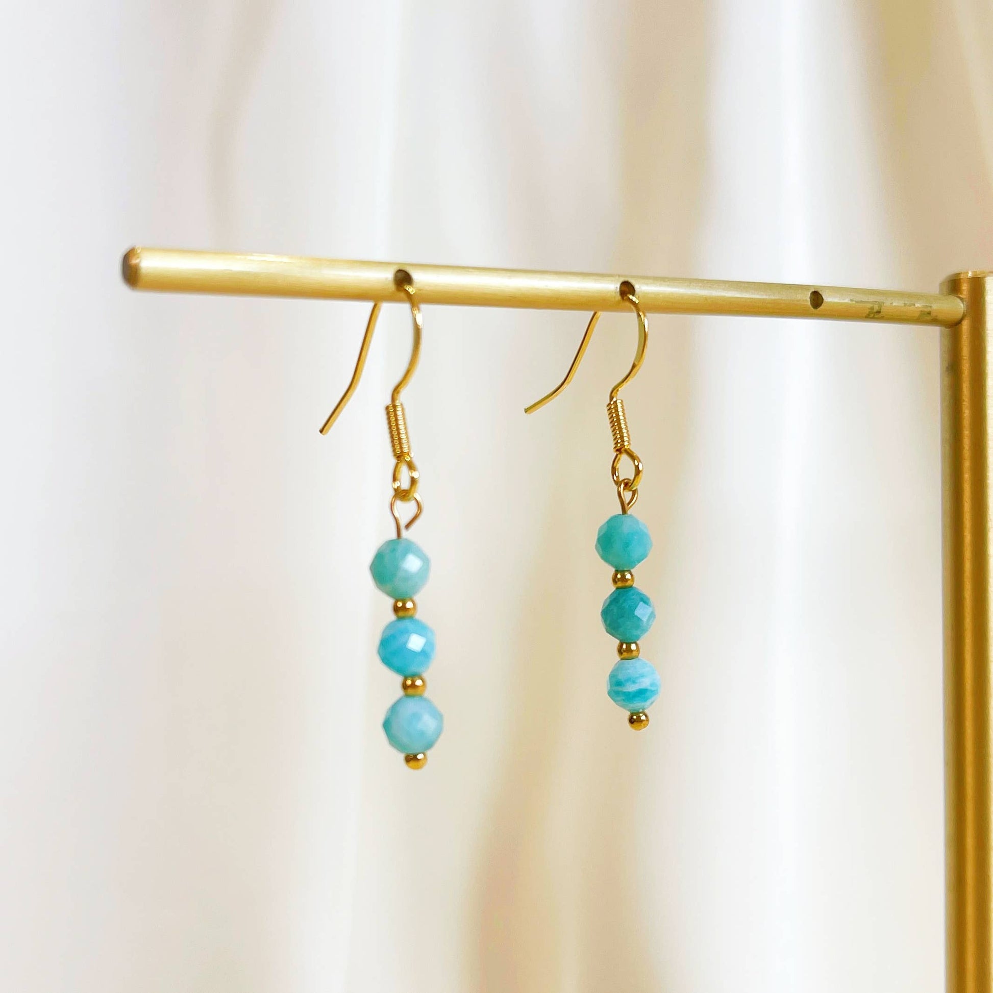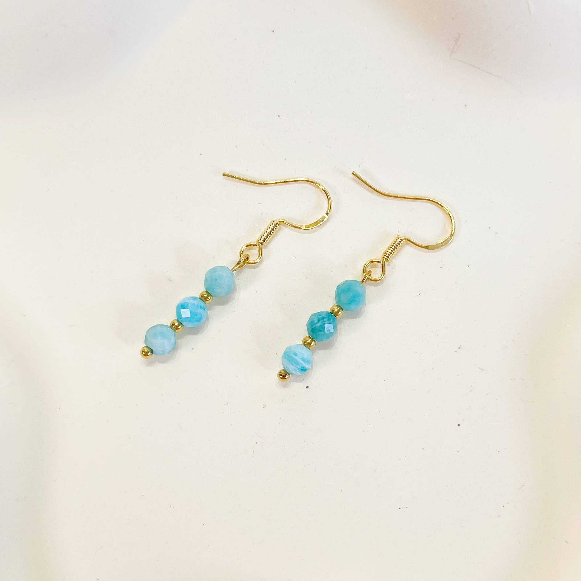 Inspired by the calming hues of the ocean, these gold and aqua blue beaded dangle earrings bring a refreshing touch of elegance to any outfit. Featuring four faceted blue beads in varying shades, delicately separated by gold accents, these earrings capture the beauty of shimmering sea waves. QUALITY - handmade in USA - Finish: 18k gold - post: hypoallergenic solid S925 sterling silver post for sensitive ears - material: premium quality tarnish resistant brass - gem: resin beads SIZE - Dimension: length- 21mm DETAILS - handmade - sustainably sourced - water resistant - tarnish resistant - hypoallergenic - nickel free - lead free