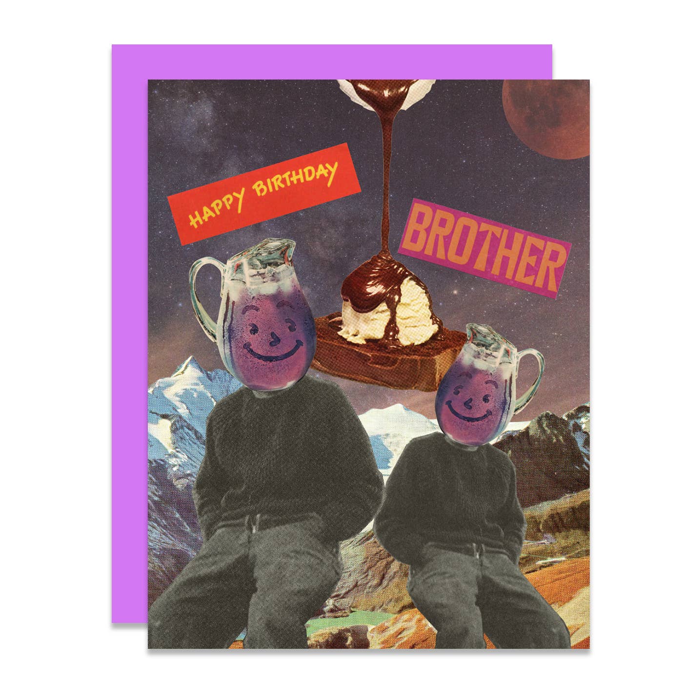 Your brother’s not normal, so why would his birthday card be? This absurdist collage features Kool-Aid jug heads, hot fudge lava mountains, and enough weird energy to make you both laugh-cry. Whether he's your sibling by birth or just someone who feels like one, this one’s for him.