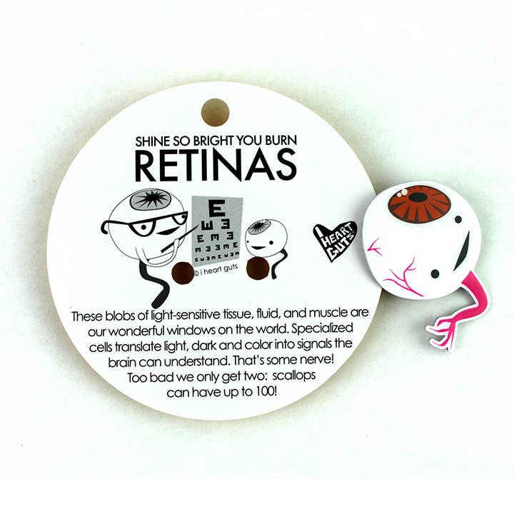 This is the eyeball pin you've been looking for, new with a brown iris!This fab little 1.25" printed aluminum brown eyeball pin is easy on the eyes and comes packed on an infocard. Great gift for eyeball health nawareness, eyeball surgery, eye doctor gifts and any other reason you see fit.