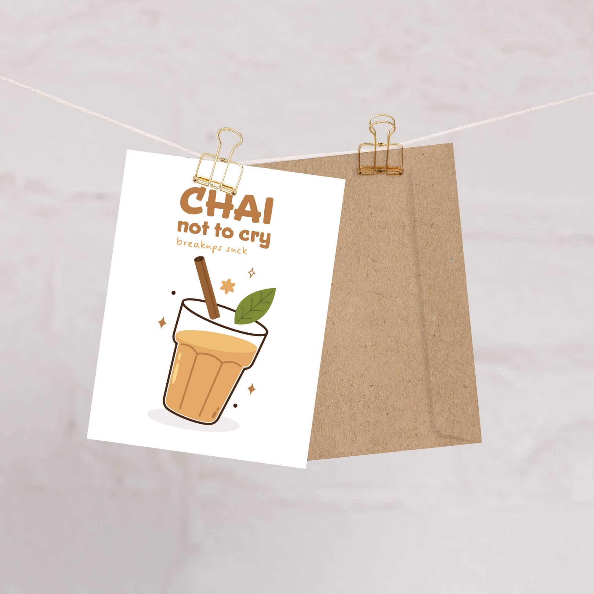 Breakups suck—but chai helps. This warm yellow card features a comforting cup of chai surrounded by cozy spices, with the perfect pun to help ease the heartache.