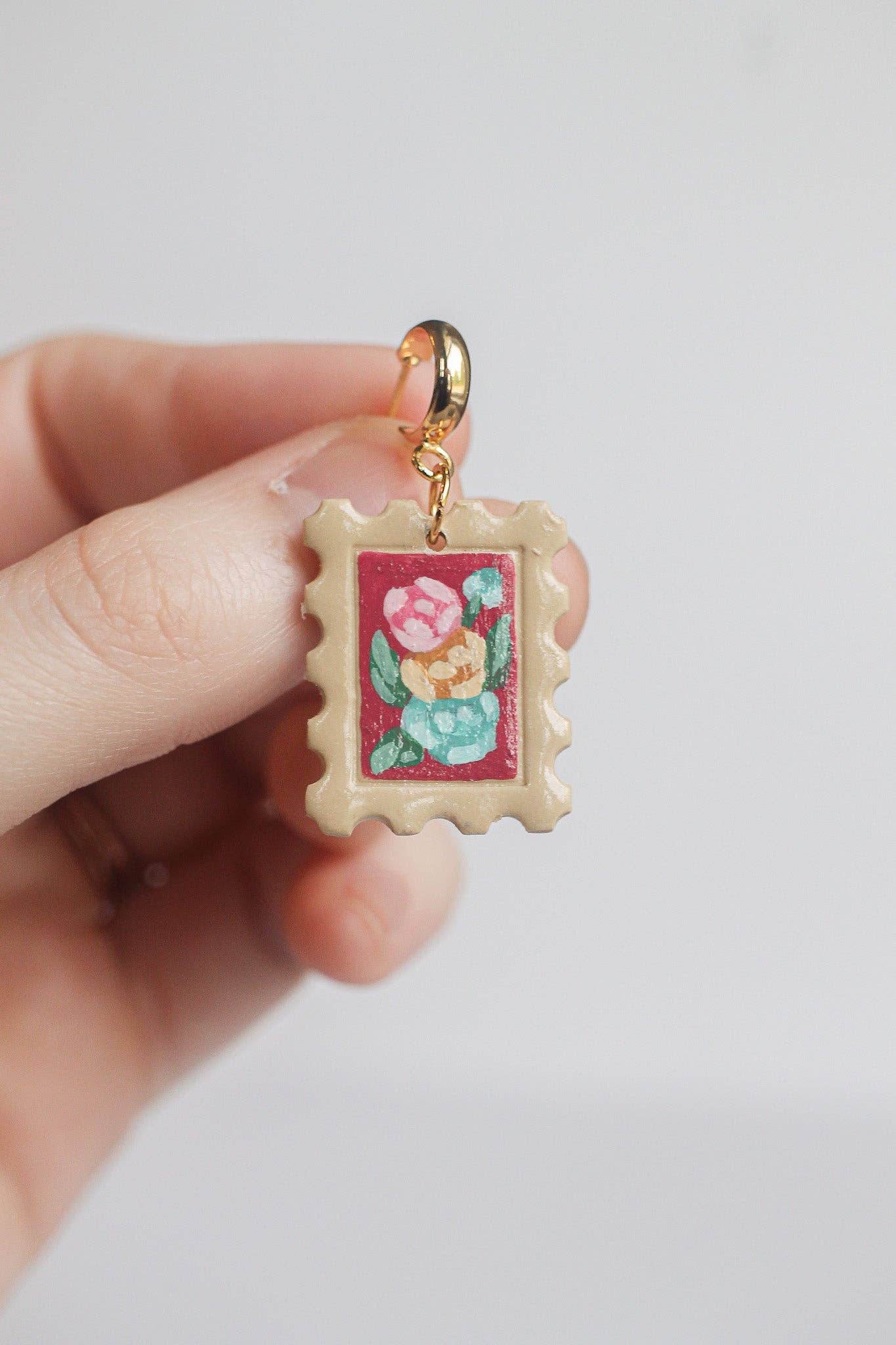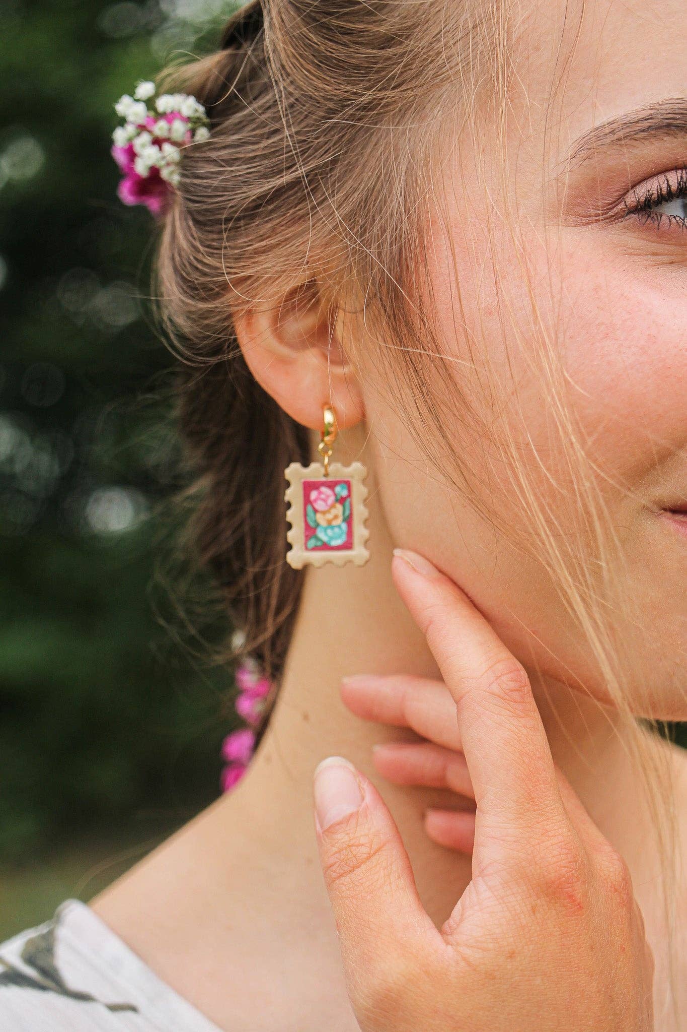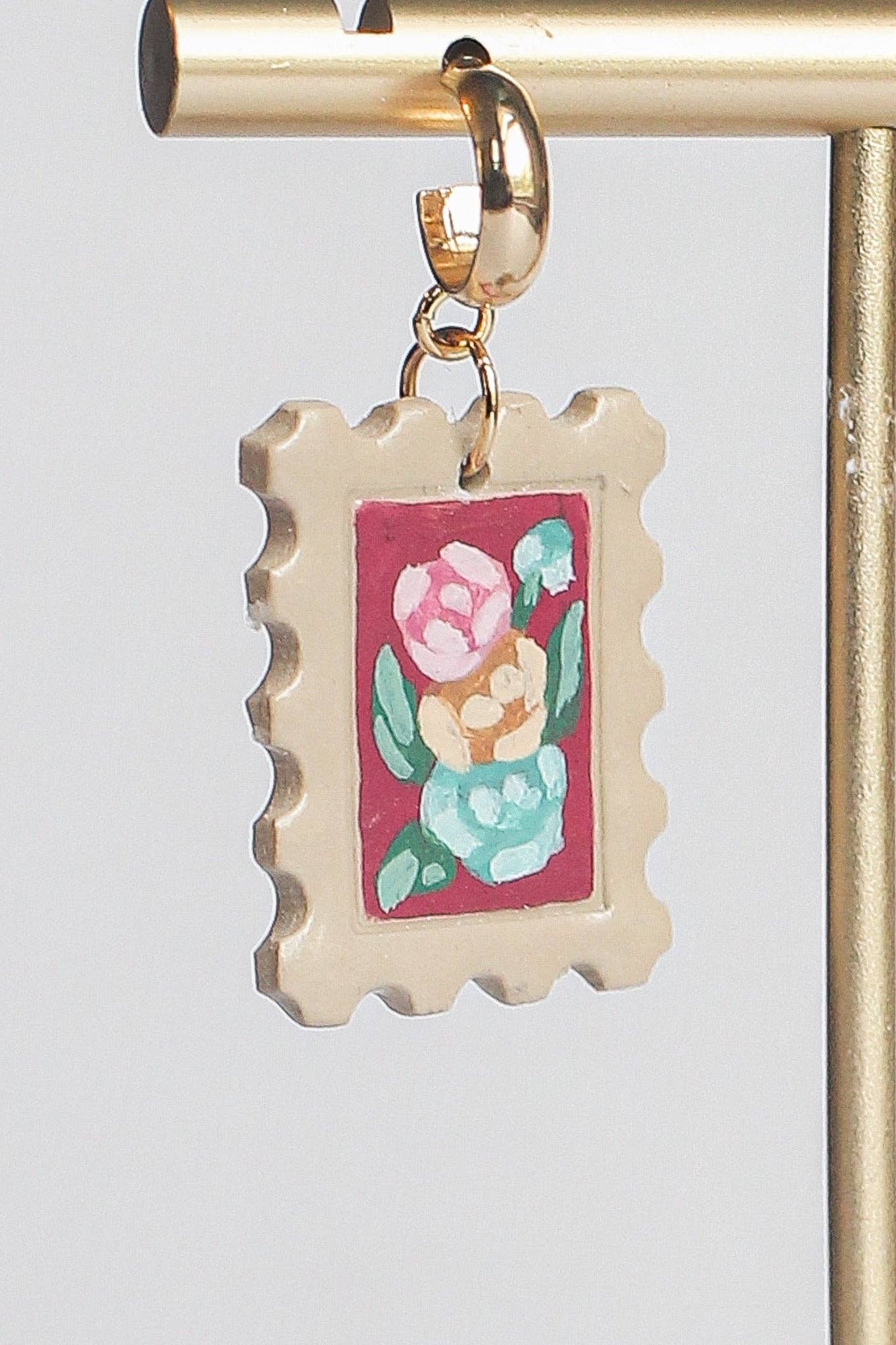 We are giving this one our stamp of approval! Okay puns aside, can we talk for a moment about how insanely gorgeous this earring is?! Made in collaboration with Mia Whitmore, this earring (and every jewelry piece in this collection) is handmade out polymer clay in studio, and then handed over to be painted by Mia. After she has meticulously painted her iconic floral designs on each one, it is handed back to us to turn them into finished jewelry pieces! Each one is truly a labor of love from both of our little women owned businesses, and we can guarantee that not only are you going to absolutely love your piece, but it will be unlike anything anyone else has!