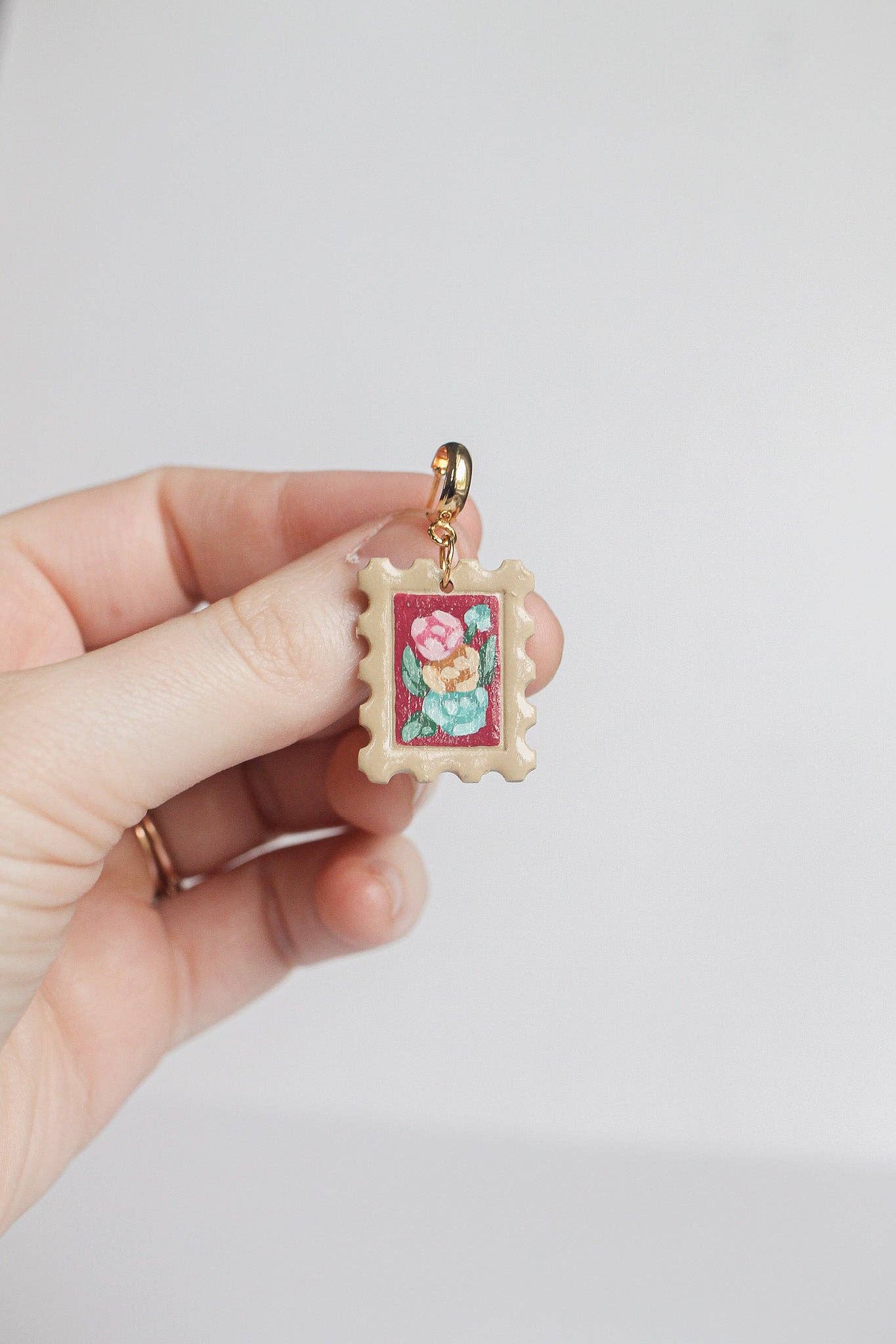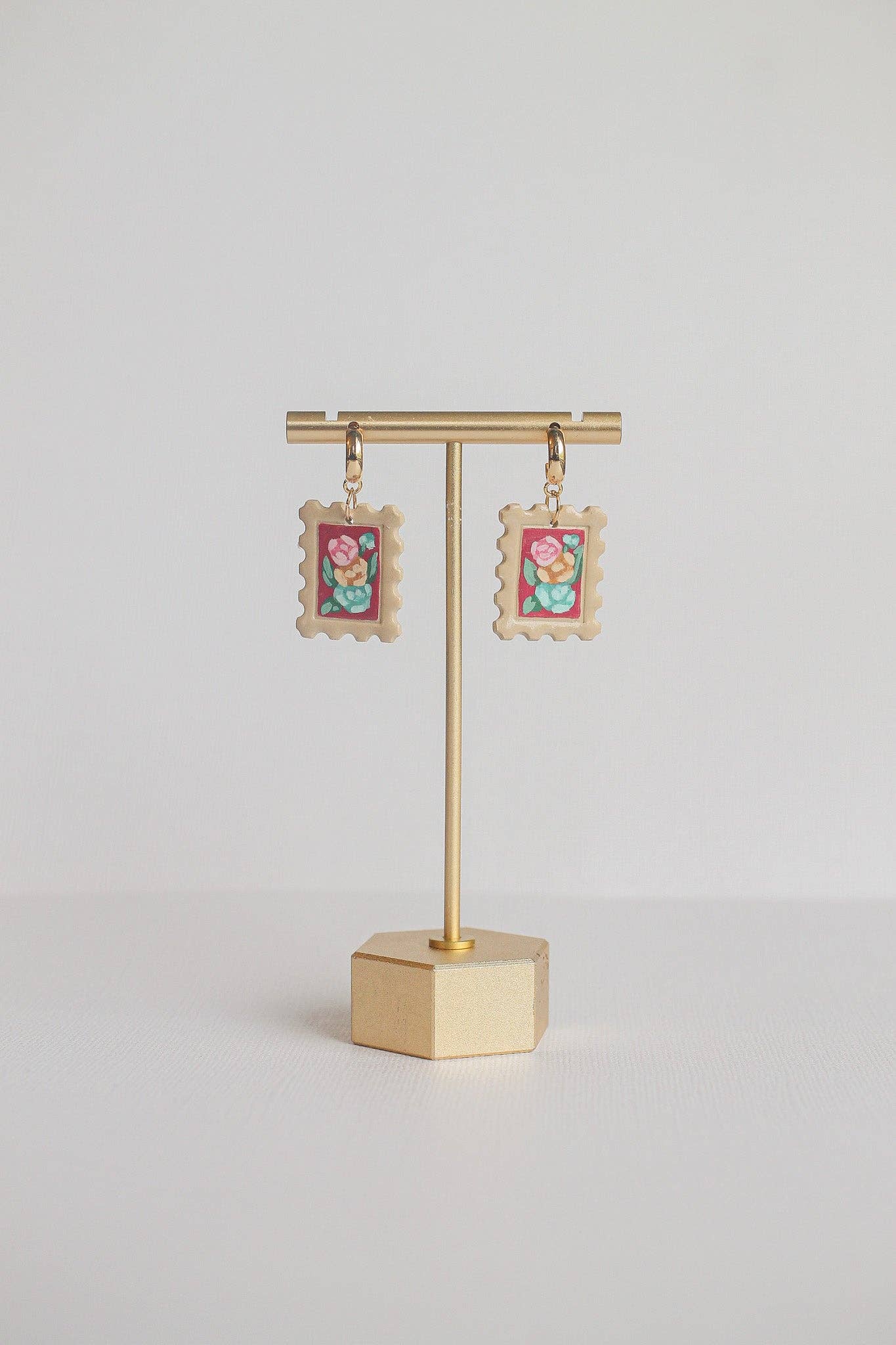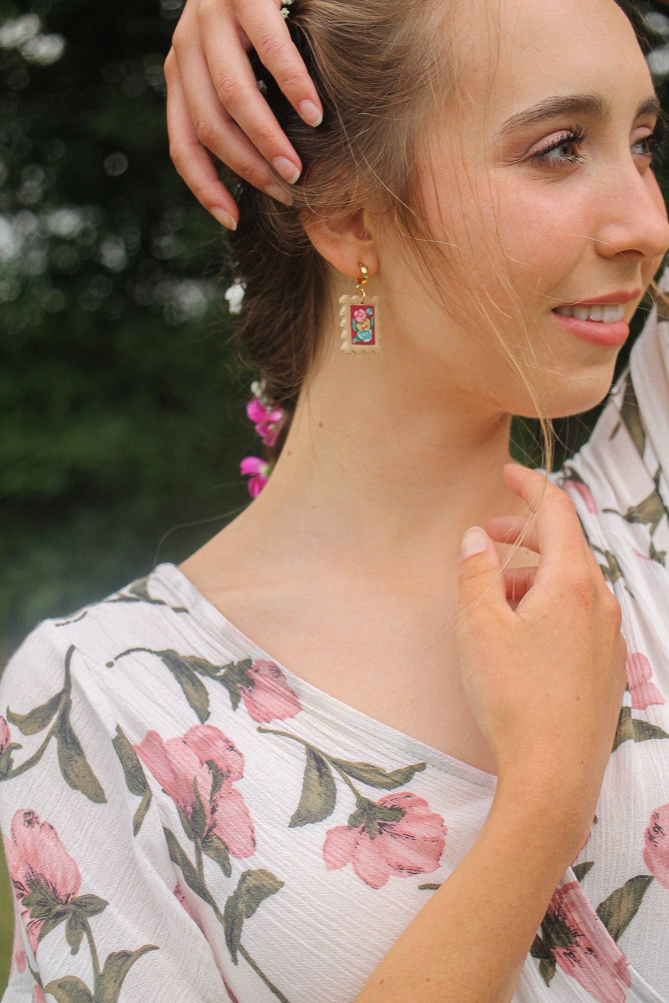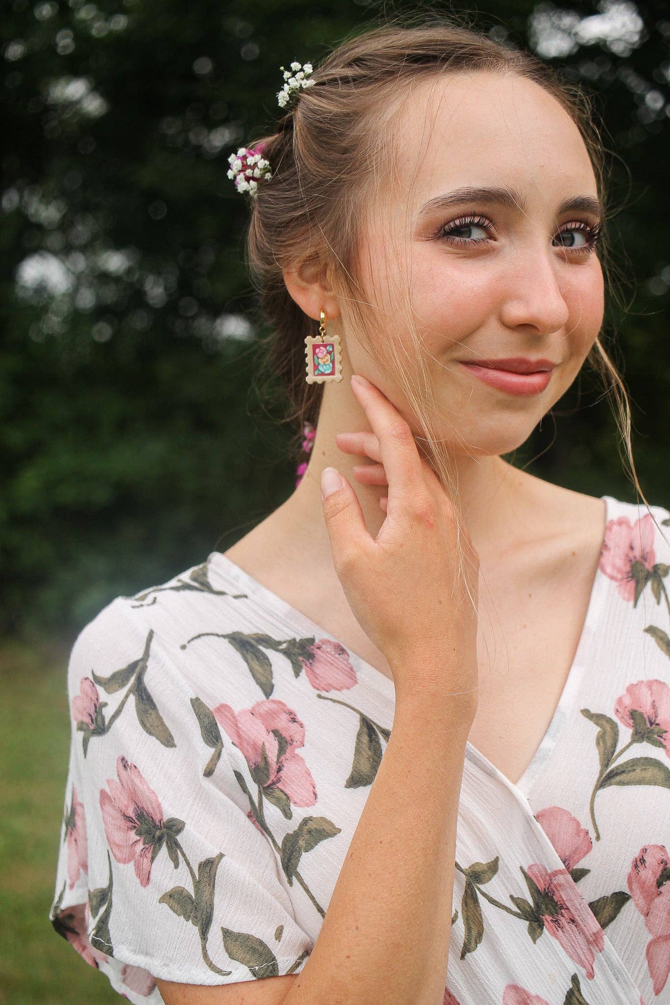 We are giving this one our stamp of approval! Okay puns aside, can we talk for a moment about how insanely gorgeous this earring is?! Made in collaboration with Mia Whitmore, this earring (and every jewelry piece in this collection) is handmade out polymer clay in studio, and then handed over to be painted by Mia. After she has meticulously painted her iconic floral designs on each one, it is handed back to us to turn them into finished jewelry pieces! Each one is truly a labor of love from both of our little women owned businesses, and we can guarantee that not only are you going to absolutely love your piece, but it will be unlike anything anyone else has!