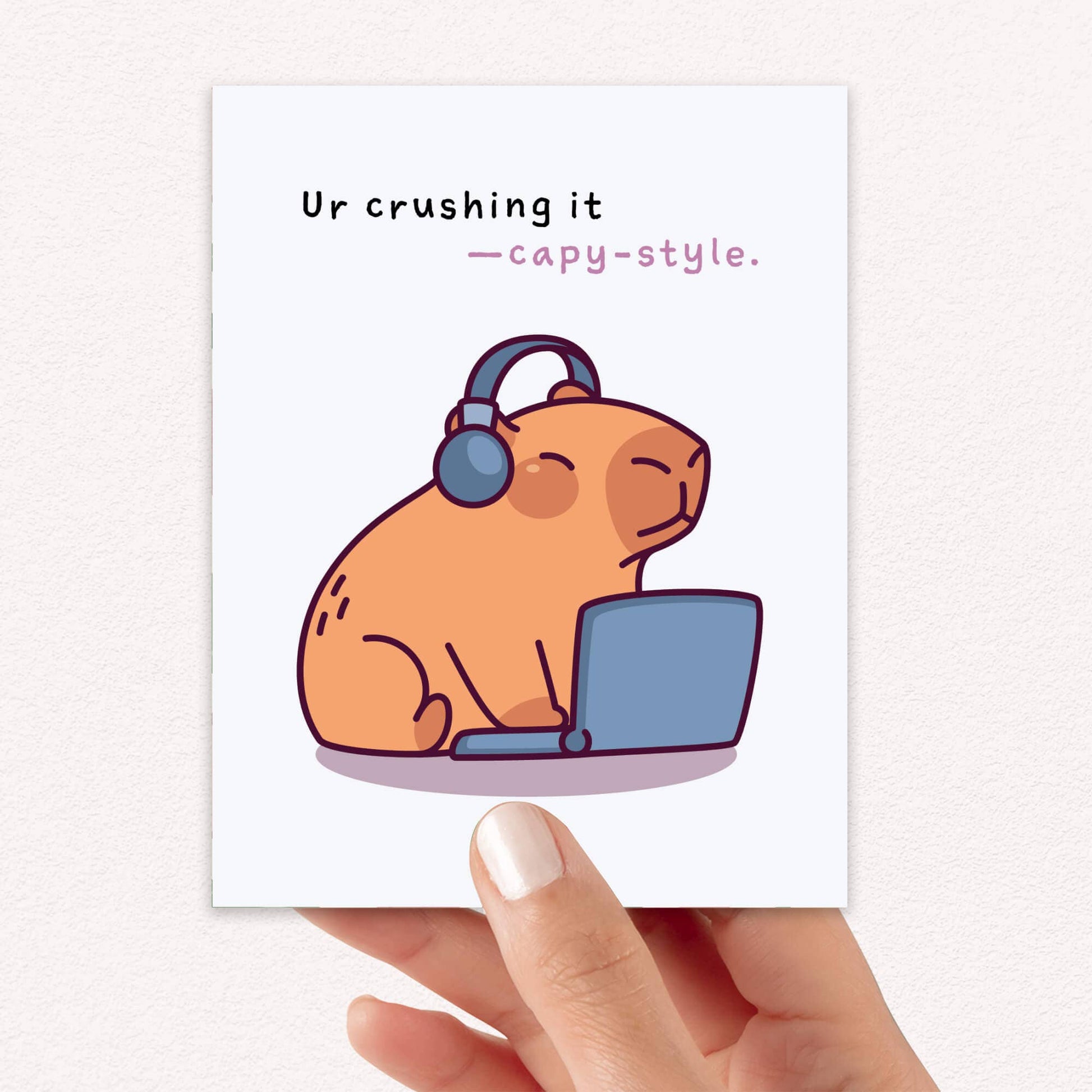 A laid-back capybara works hard with headphones and a laptop—proof that chill and hustle can coexist. This card is a quirky, fun way to cheer someone on with low-key capy energy.