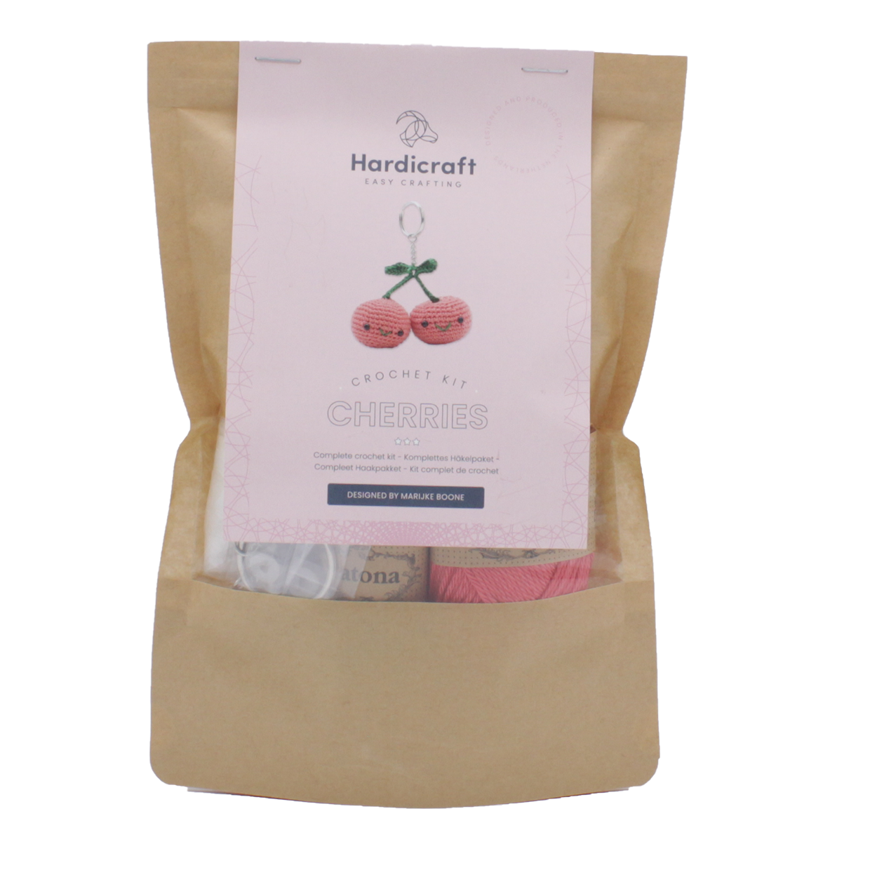 Pimp your bag with this cute Cherry bag hanger. Every (school) bag or keychain needs one anyway! This package includes a pattern, high-quality 100% cotton yarn and all the haberdashery needed to get to work (excluding crochet hook). The cherries are approximately 8 cm high and made with a 2.5 mm crochet hook.