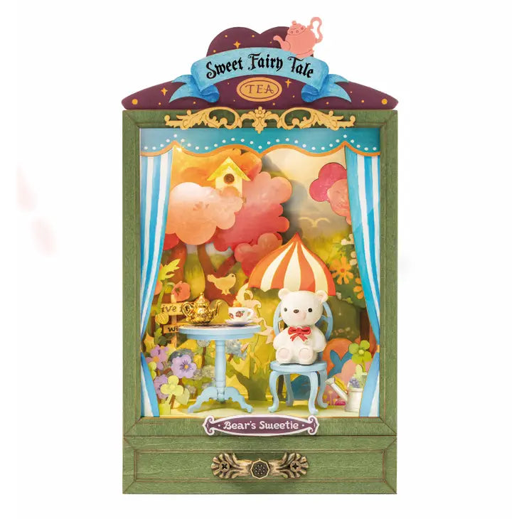This teddy bear tea party scene DIY kit is the perfect activity for all craft enthusiasts. The beautiful diorama is protected by a slide-in transparent cover, and a pull-out drawer adds some functionality. The warm light add more ambience that draws the eyes of onlookers.