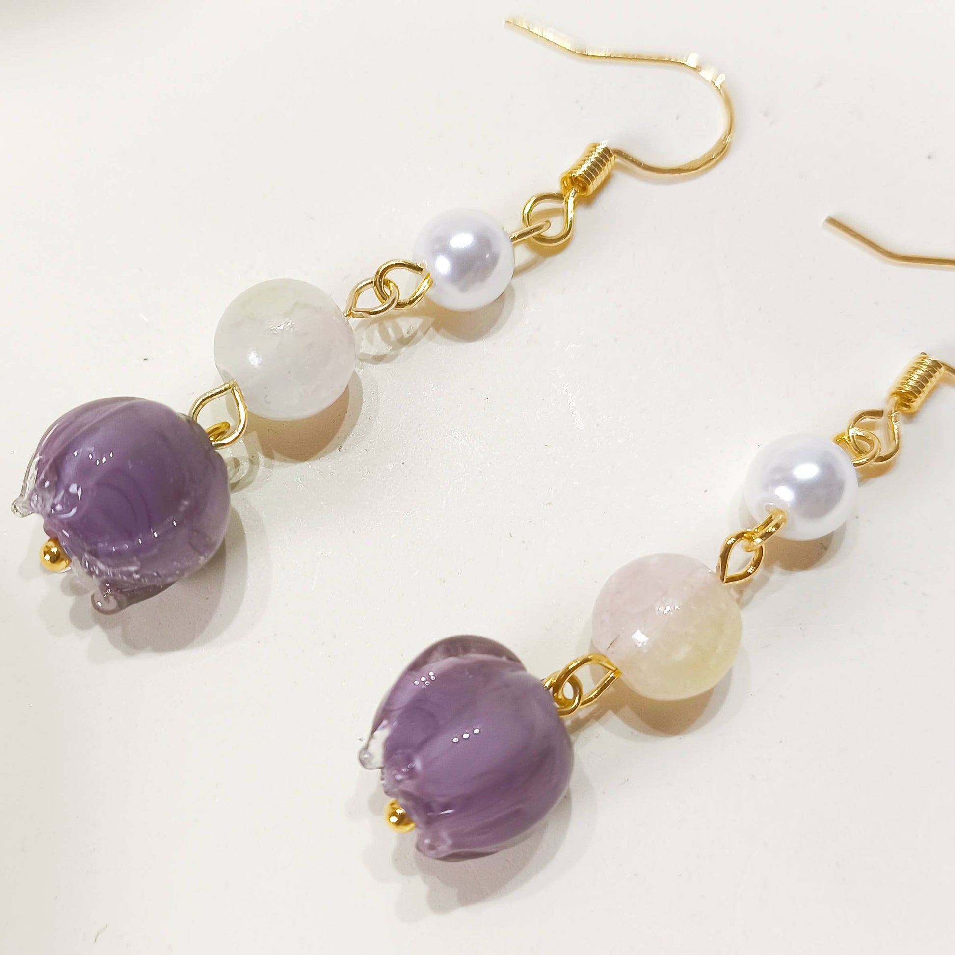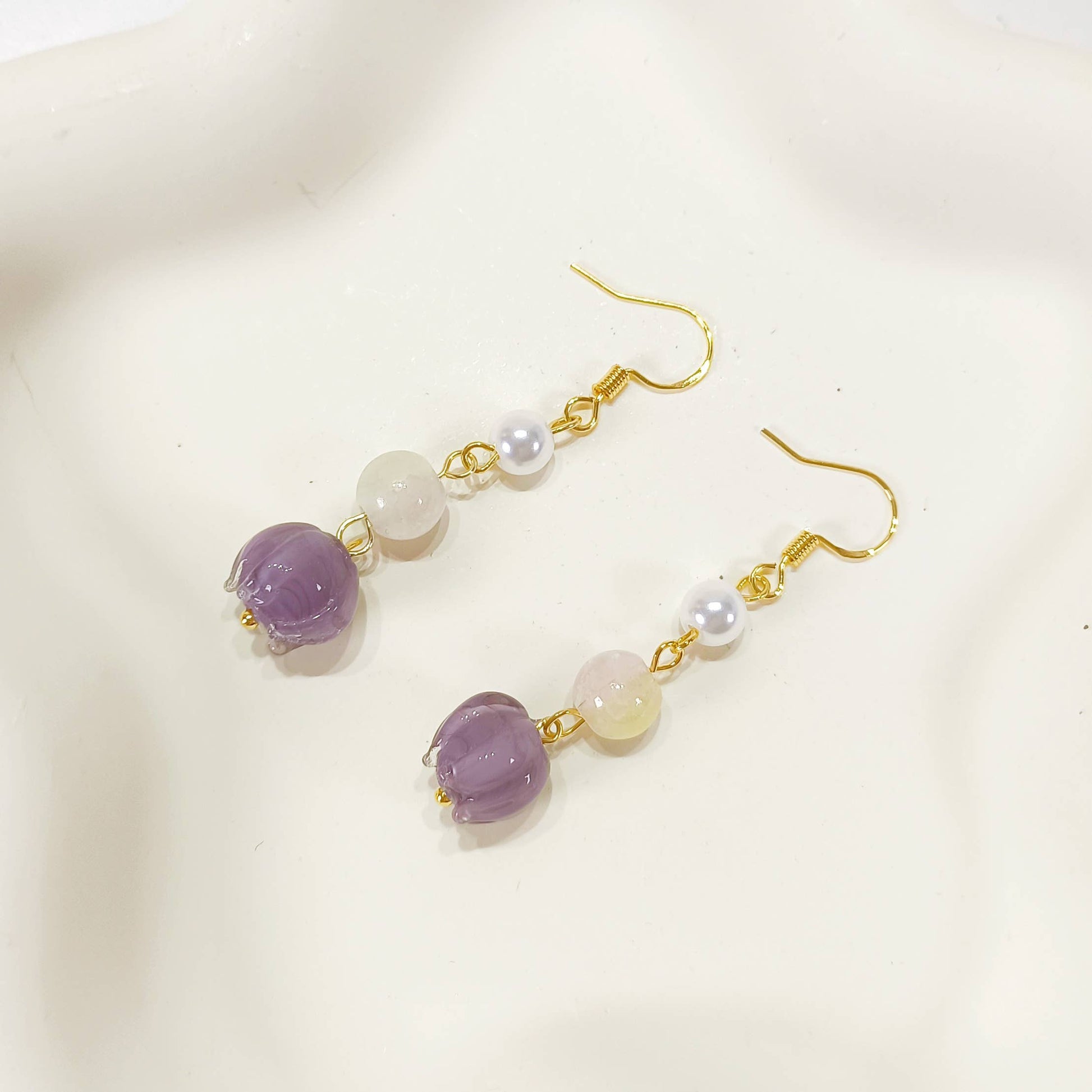 Elevate your look with these elegant lavender glass flower drop earrings, paired with soft pearl and milky white beads for a dreamy, ethereal touch. Their lightweight design and delicate craftsmanship make them a perfect accessory for romantic evenings or everyday sophistication.