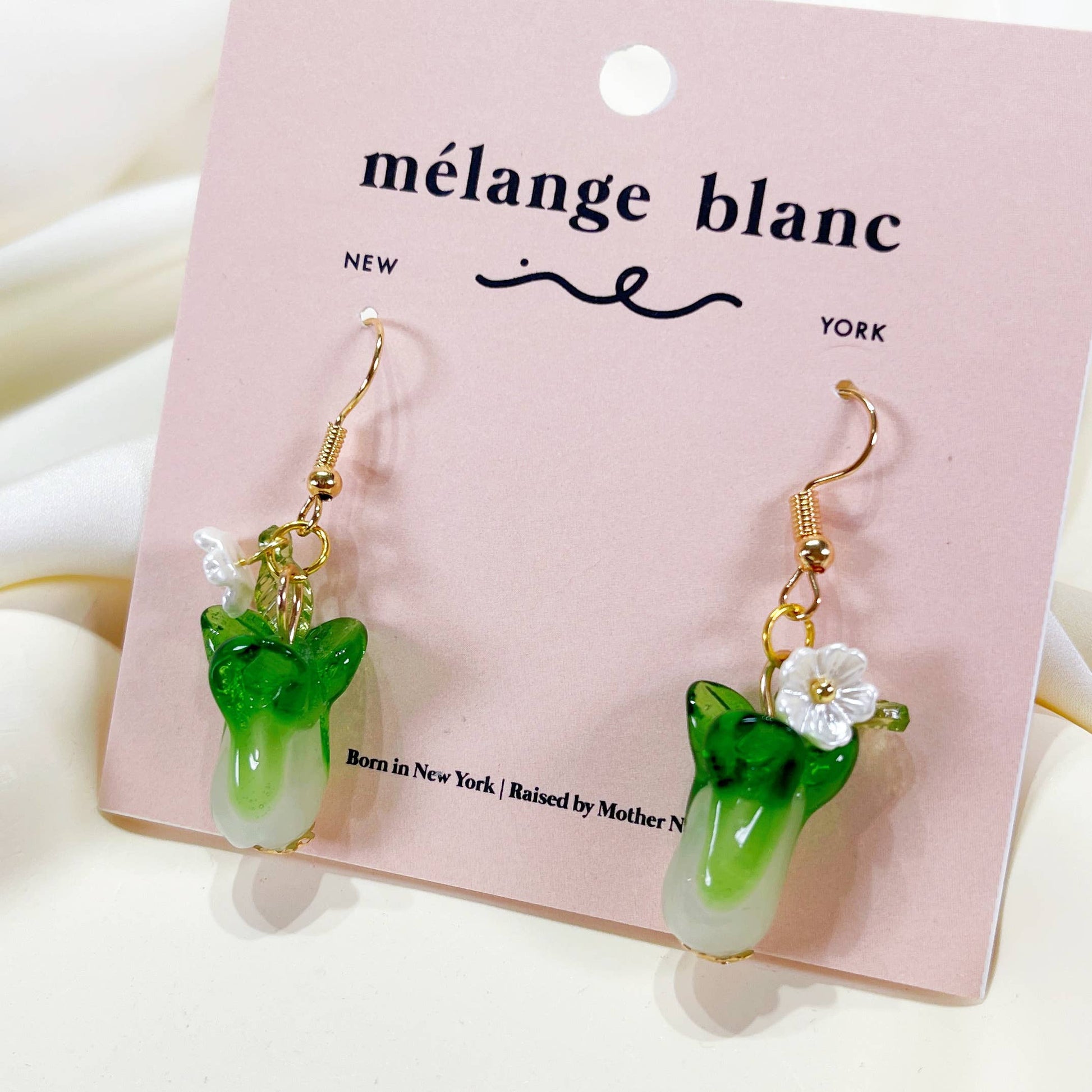Celebrate your love for unique accessories with these handcrafted bok choy earrings, designed with lush green glass and accented by delicate white blossoms. A playful yet elegant statement piece, they are perfect for adding a fresh and whimsical touch to your outfit.