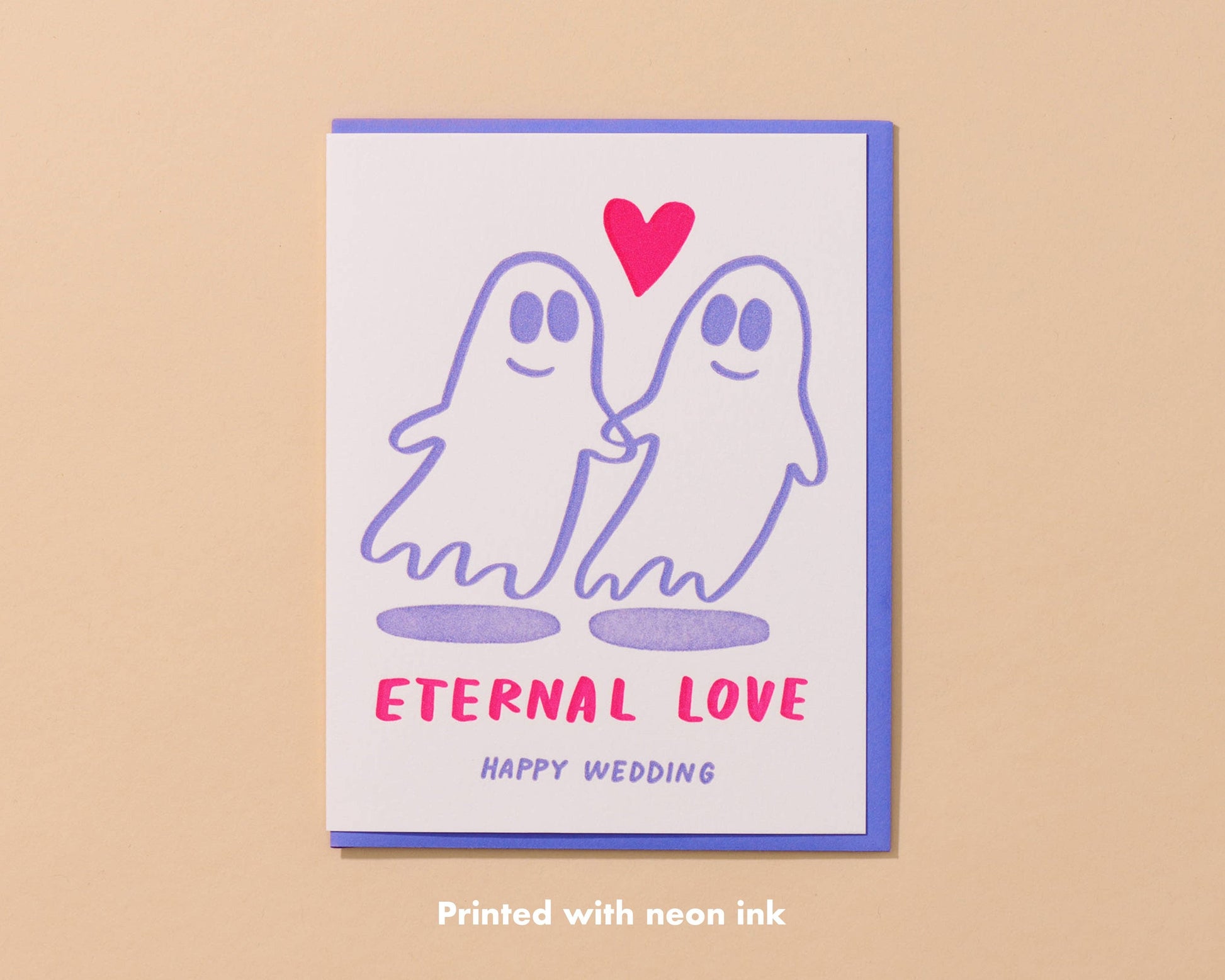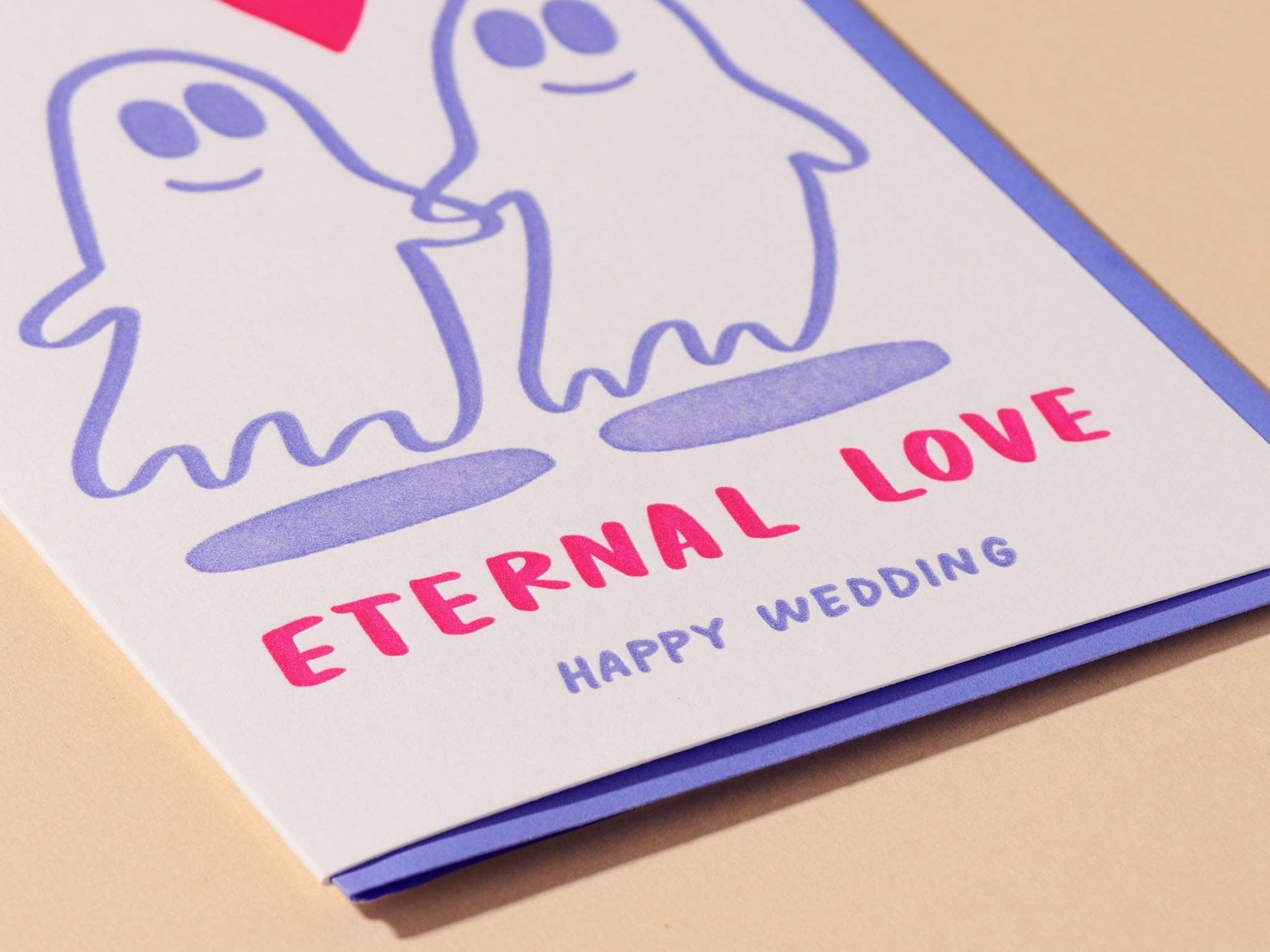 • Card reads: Eternal love / Happy Wedding" below an image of two ghosts holding hands.