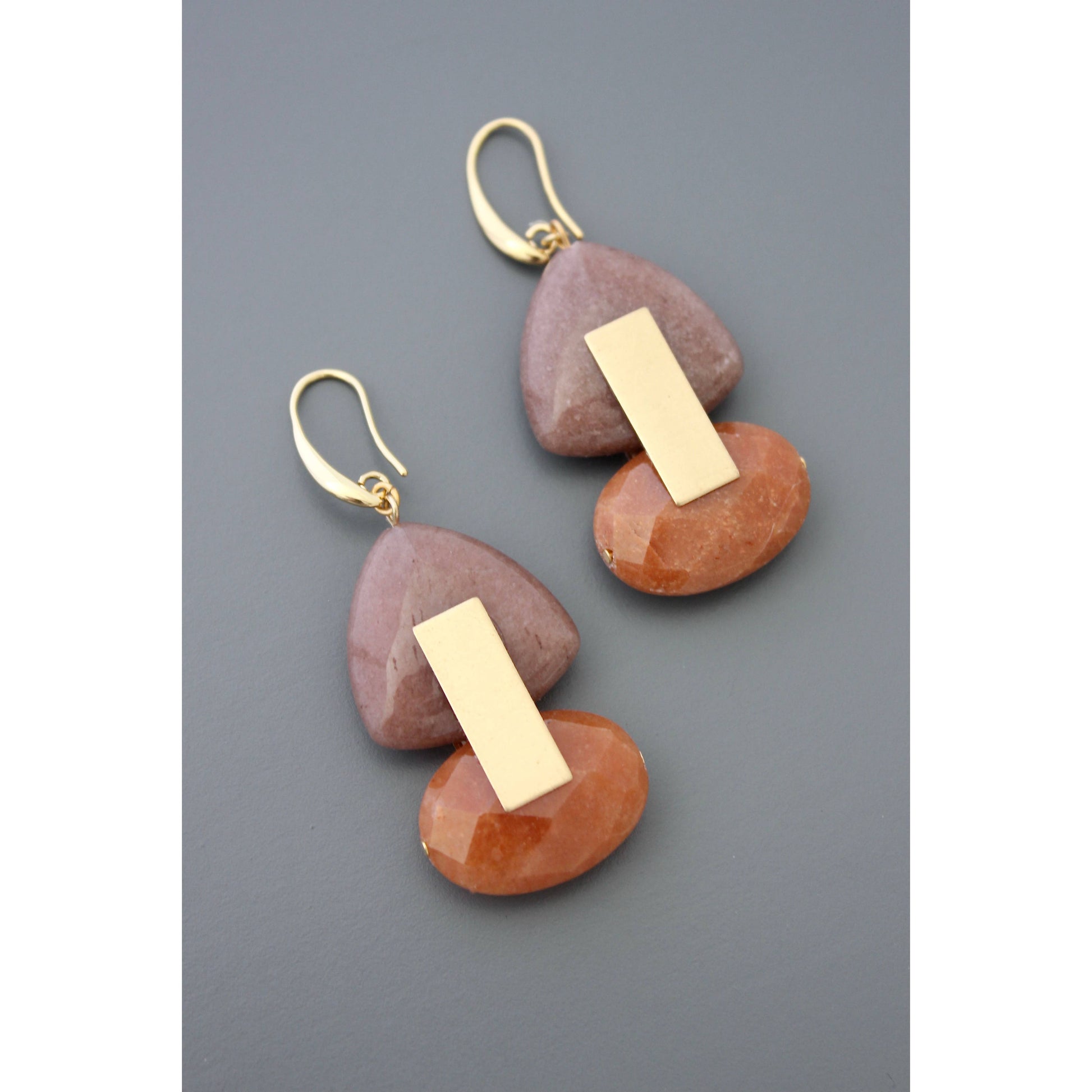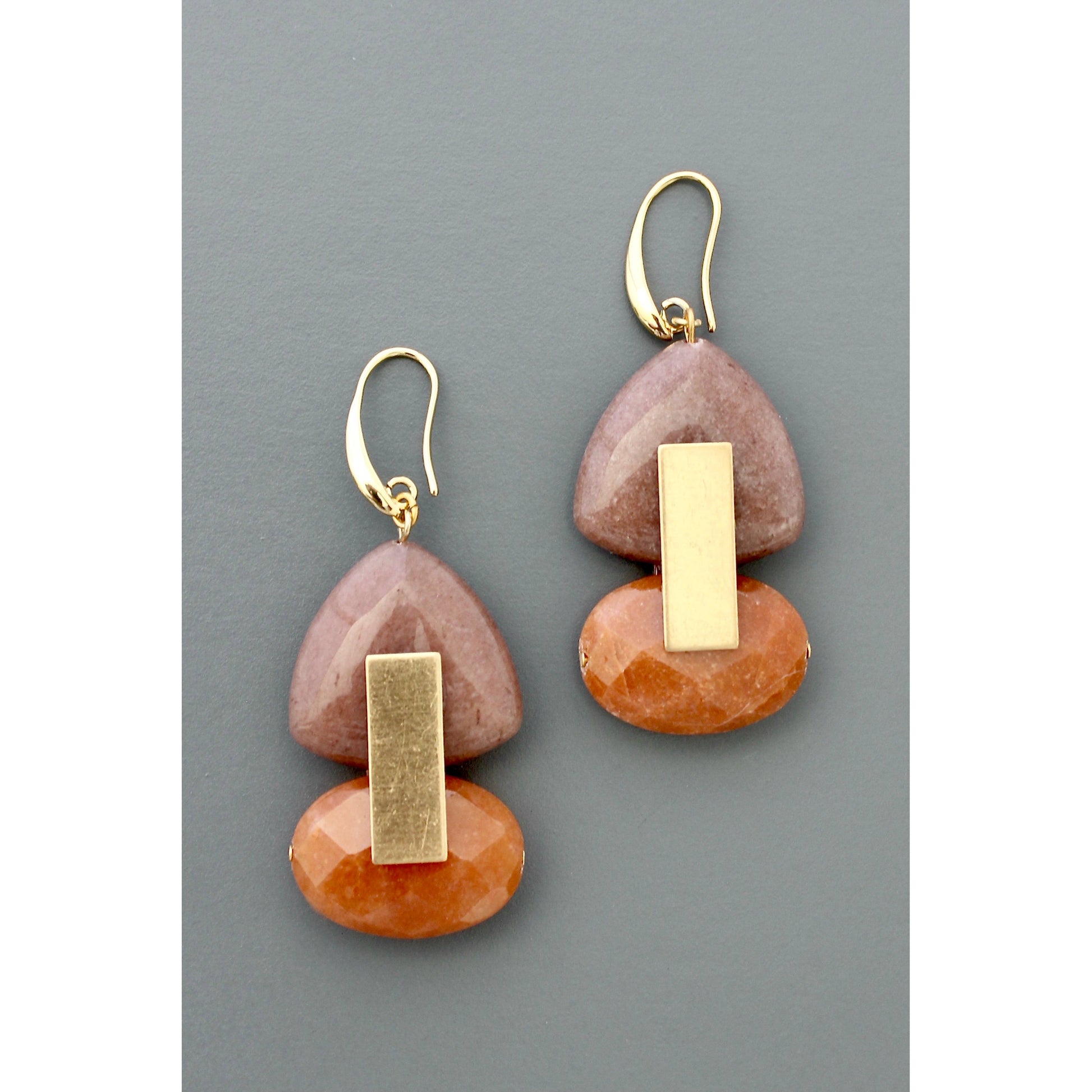 Gold plated brass hooks with mauve and carnelian dyed jade. Each earring weighs .55 oz. and measures 2.675 inches long.