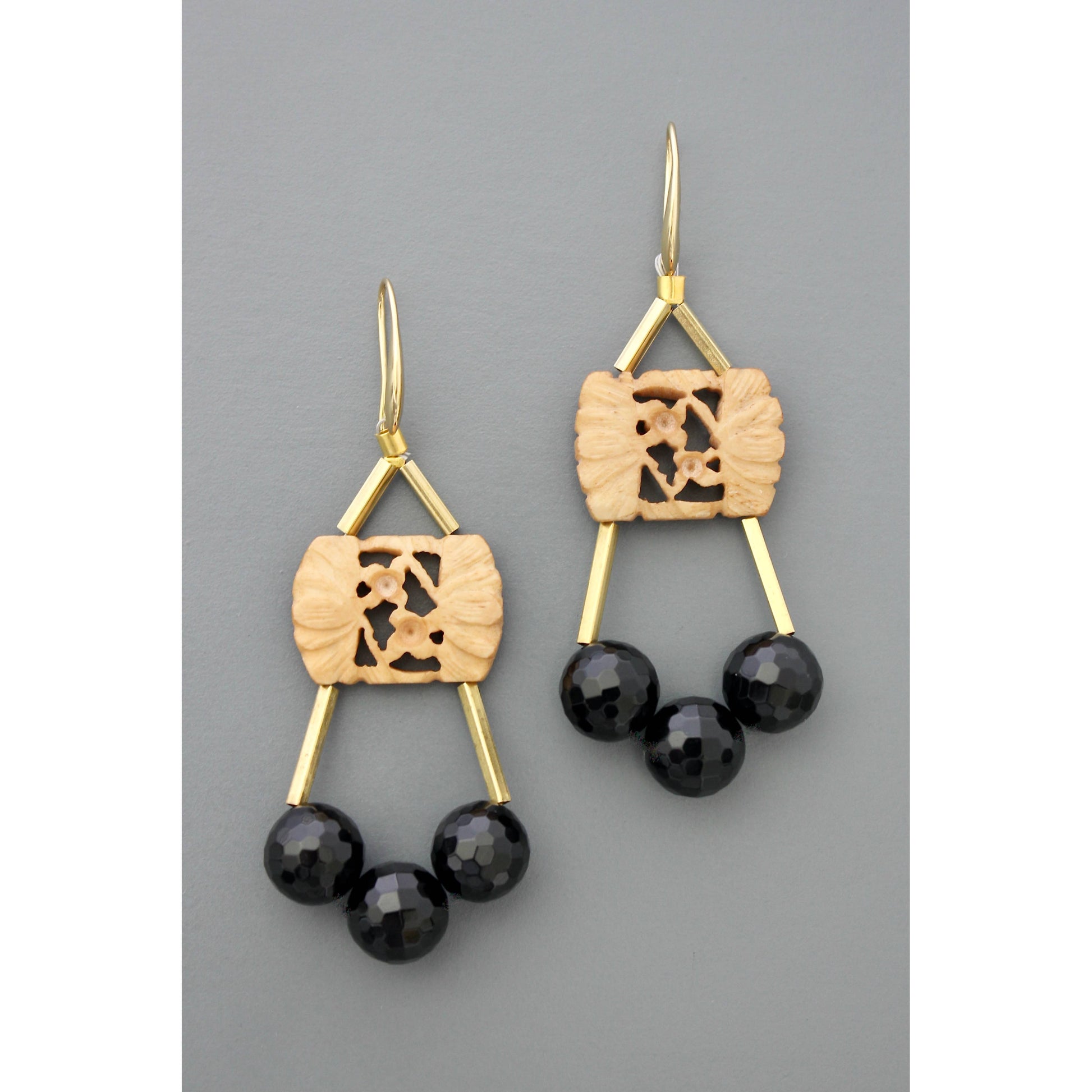 Gold plated brass hooks with carved bone and faceted black agate beads. Each earring weighs .335 oz. and measures 3.25 inches long.