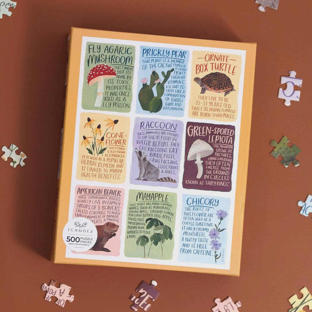 Go on a fun and educational adventure as you assemble our Flora and Fauna Facts Puzzle! Explore hand-painted mushrooms, flowers, a prickly pear, turtle, beaver, and raccoon while reading beautiful hand-lettered fun facts about each plant and animal. This easy-to-assemble puzzle makes the perfect gift for kids and adults who love exploring nature, botany, and the great outdoors! 500 pieces Ages 8+ Easy difficulty Completed Puzzle: 18" x 24" Box Size: 8"x10"x2"