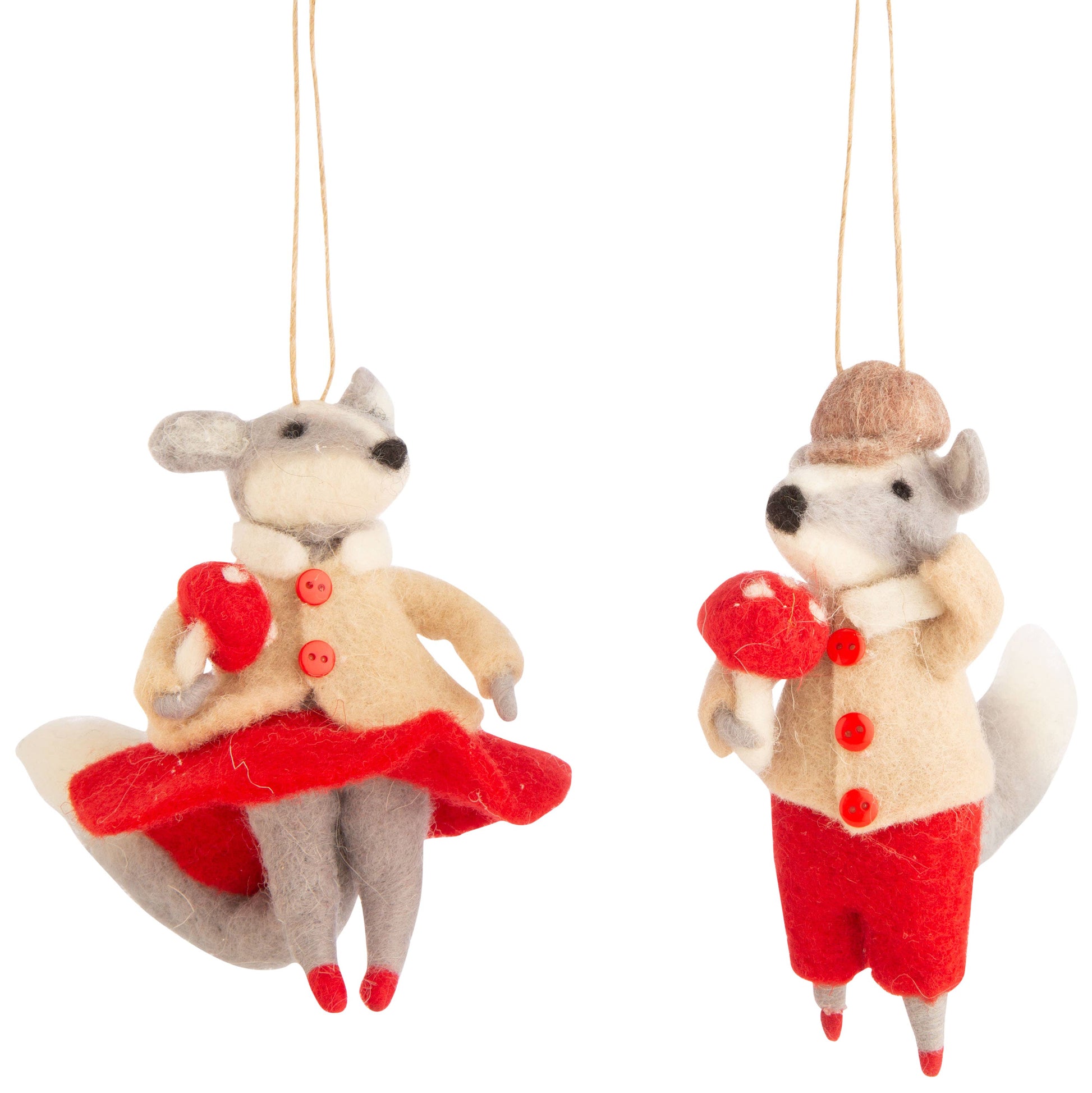 2 Asst'd Dressed felt mouse ornaments carrying mushrooms. The dimensions are approximately 6in. Please note: MATERIAL: Polyester Filled, Felt