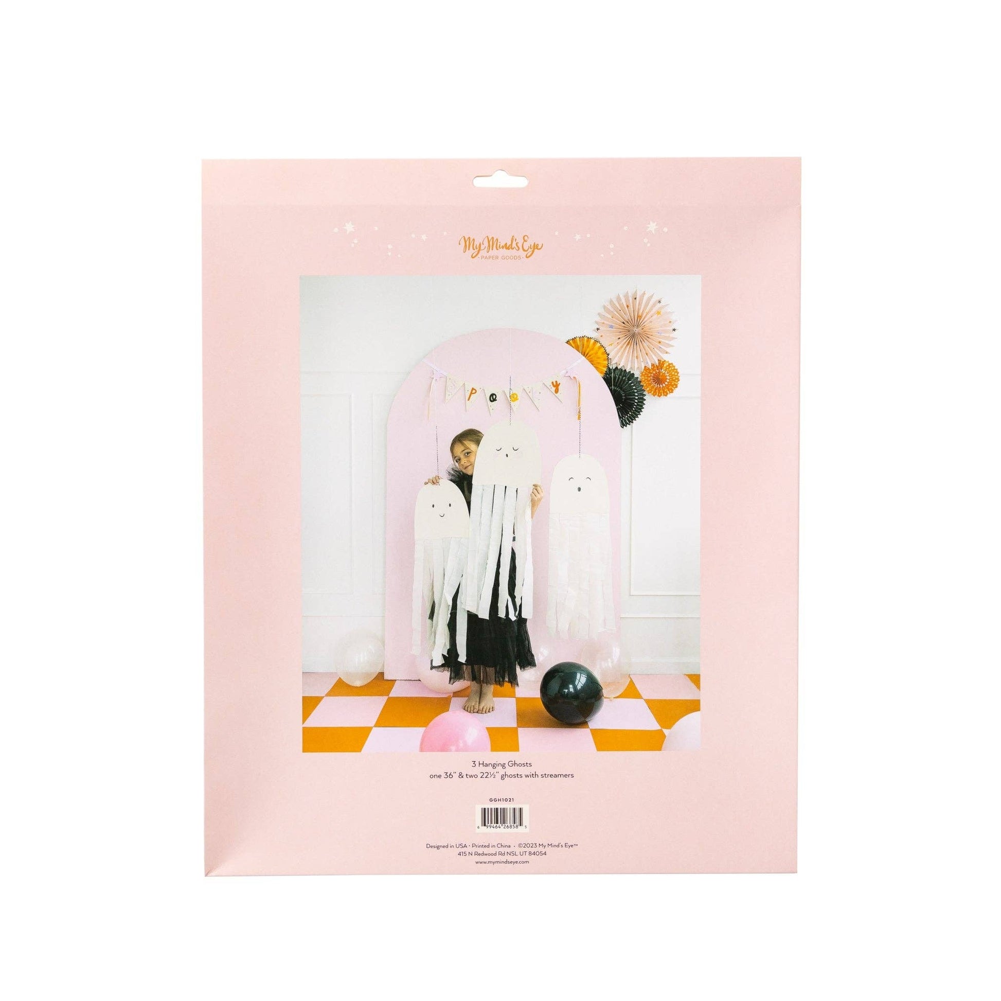 Hang with the ghouls this Halloween with this set of hanging ghosts. Included are 3 ghost that feature crepe streamers for an extra frightful detail and are sure to add just the right amount of fright your Halloween party.