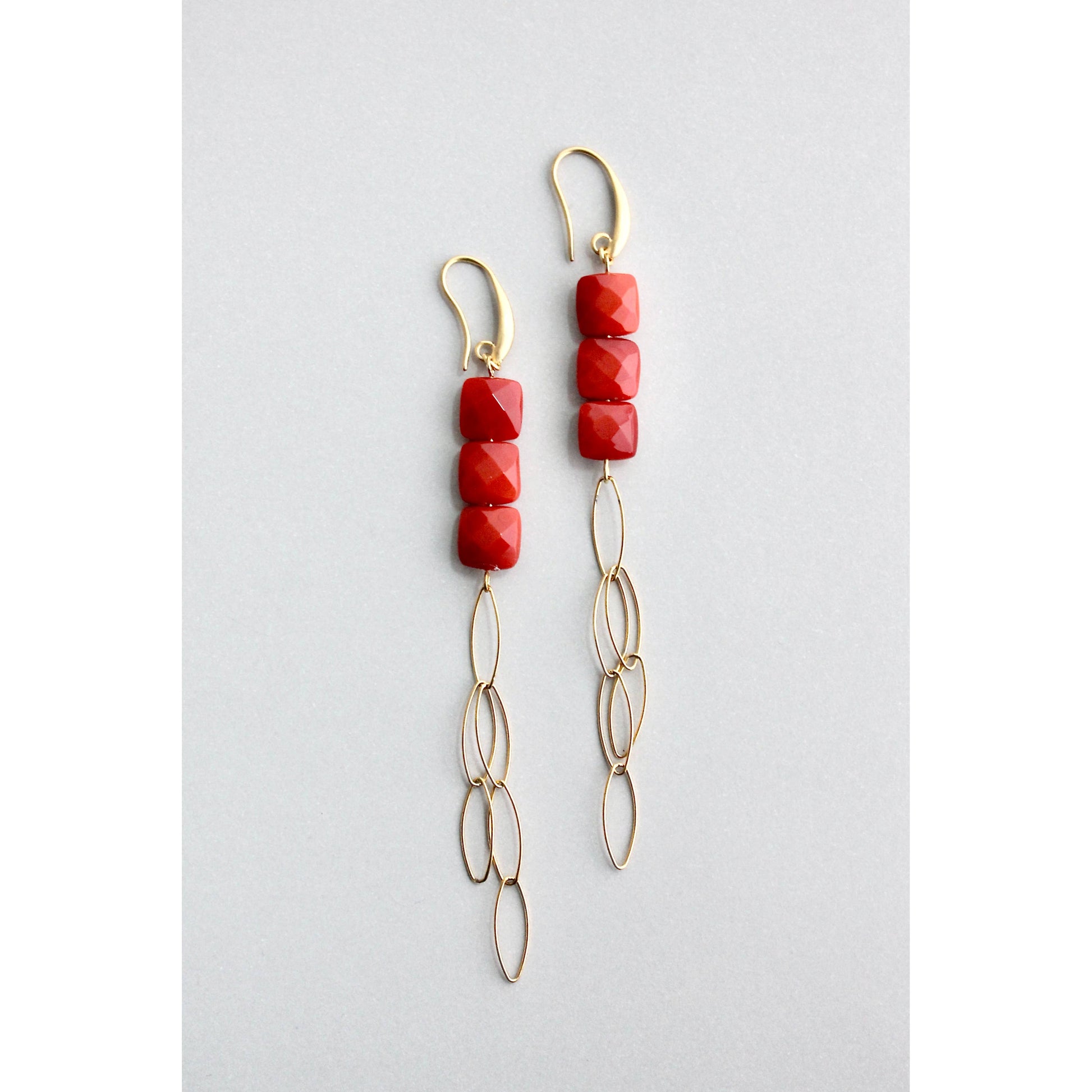 18k gold plated brass hook earrings with agate and gold plated fringe chain. Each earring weighs .13 oz and measures 4.75 inches.