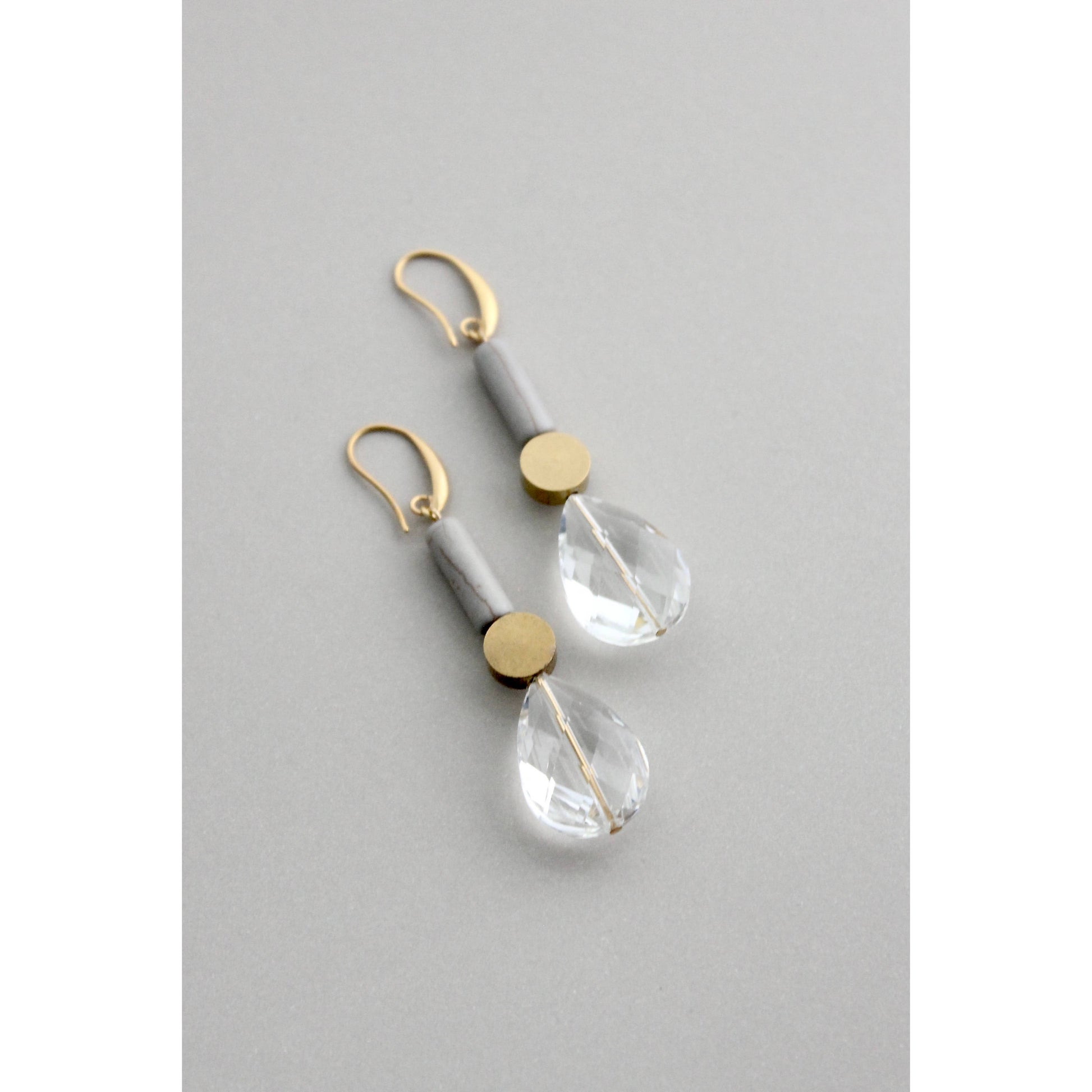 18k gold plated brass hook earrings with magnesite and glass. Each earring weighs .30 oz and measures 3 inches.