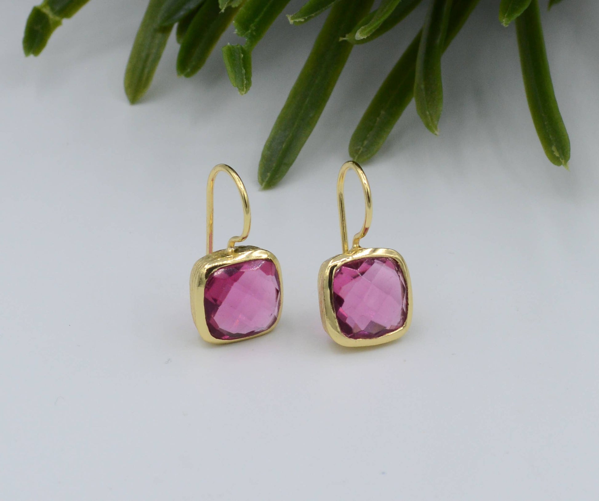 Faceted cushion cut pink tourmaline hydro earrings featuring 22k gold plating set in brass. These earrings boast a stunning hue that pairs perfectly with any ensemble throughout the year. Measuring 1/20" in length.