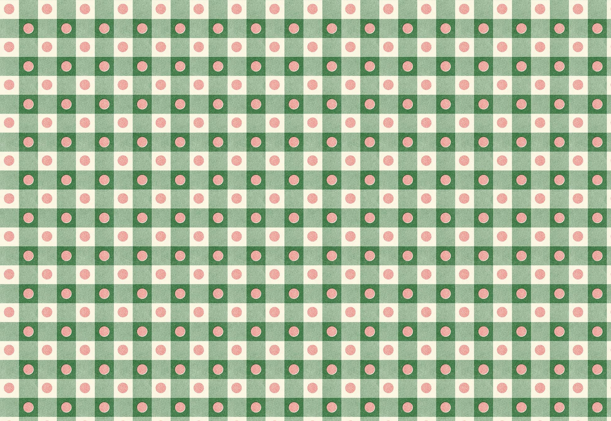 Green checkered wrapping paper with cheerful pink dots. A whimsical retro design on heavyweight stock.