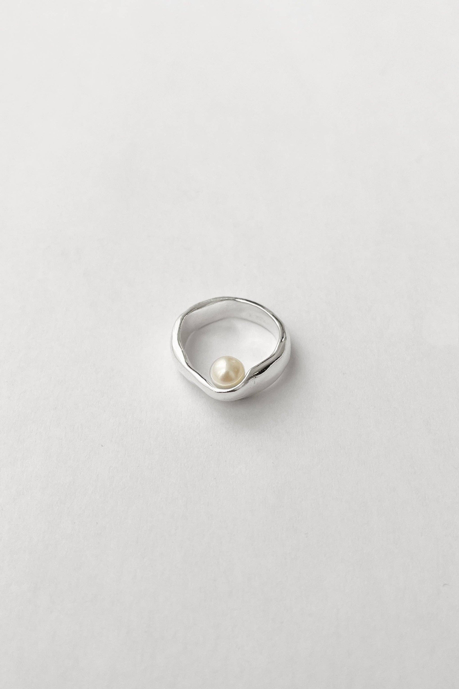 An organic textured ring with a sort of flat, wide top with a pearl nestled underneath, just visible from the top... like a little secret.