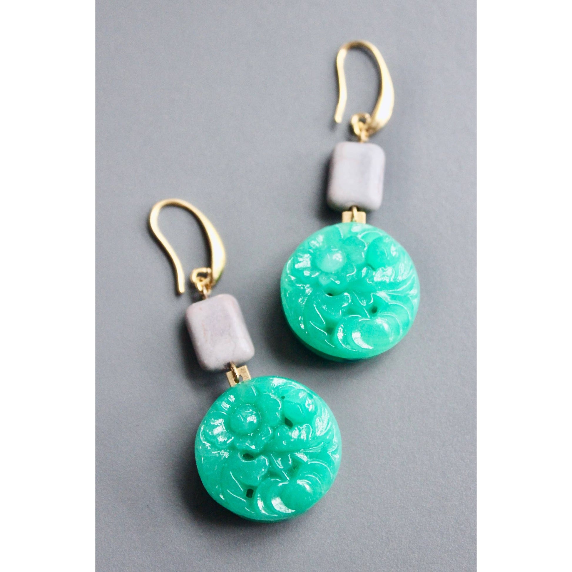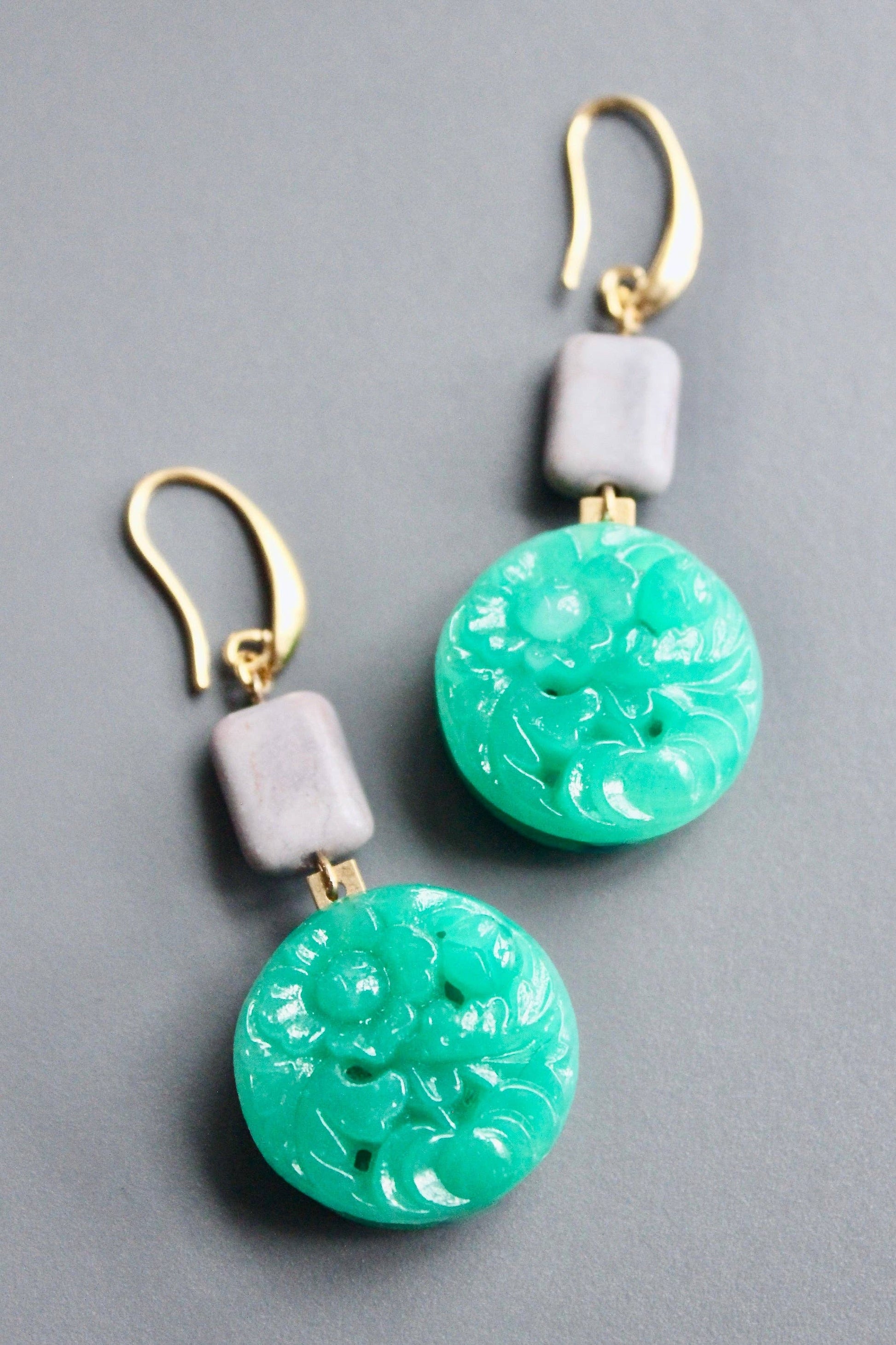 18k gold plated brass hooks with vintage Japanese pressed green glass and gray magnesite. Each half pair weighs .46 oz and measures 2.5 inches.