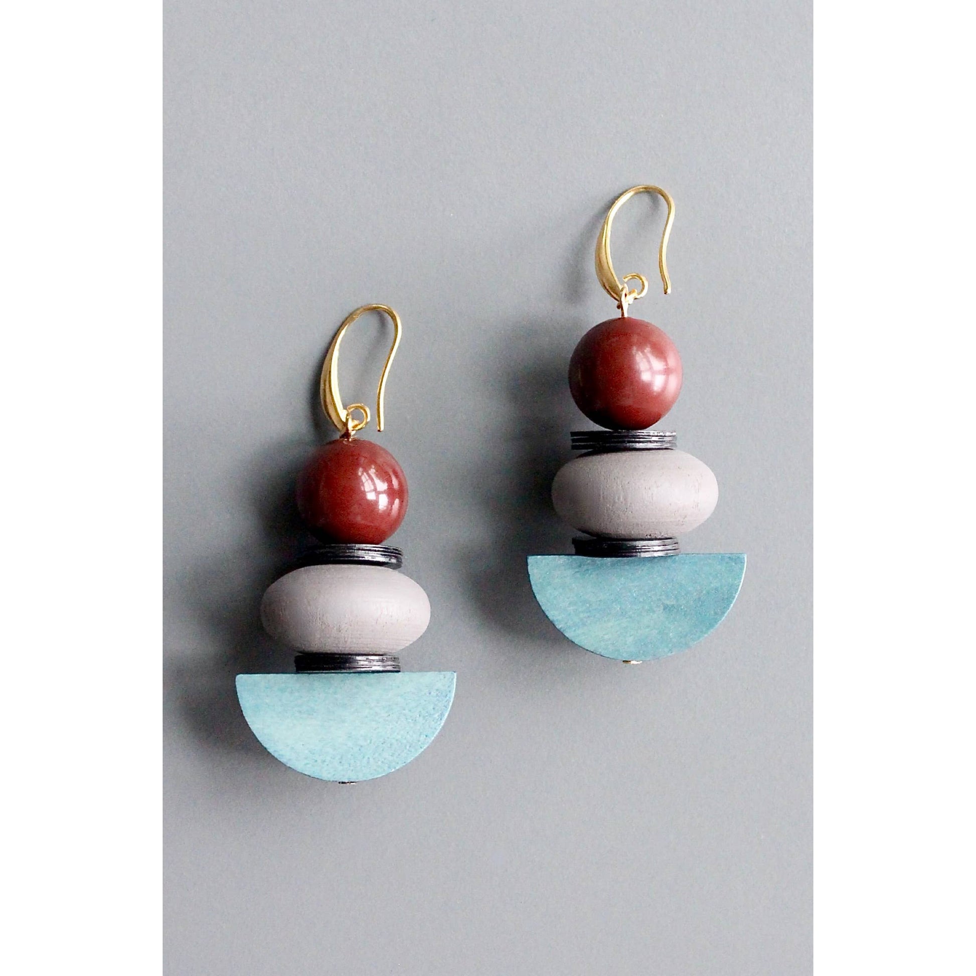 18k gold plated brass hooks with acrylic and painted wood. Each half pair weighs .27 oz and measures 2.75 inches.