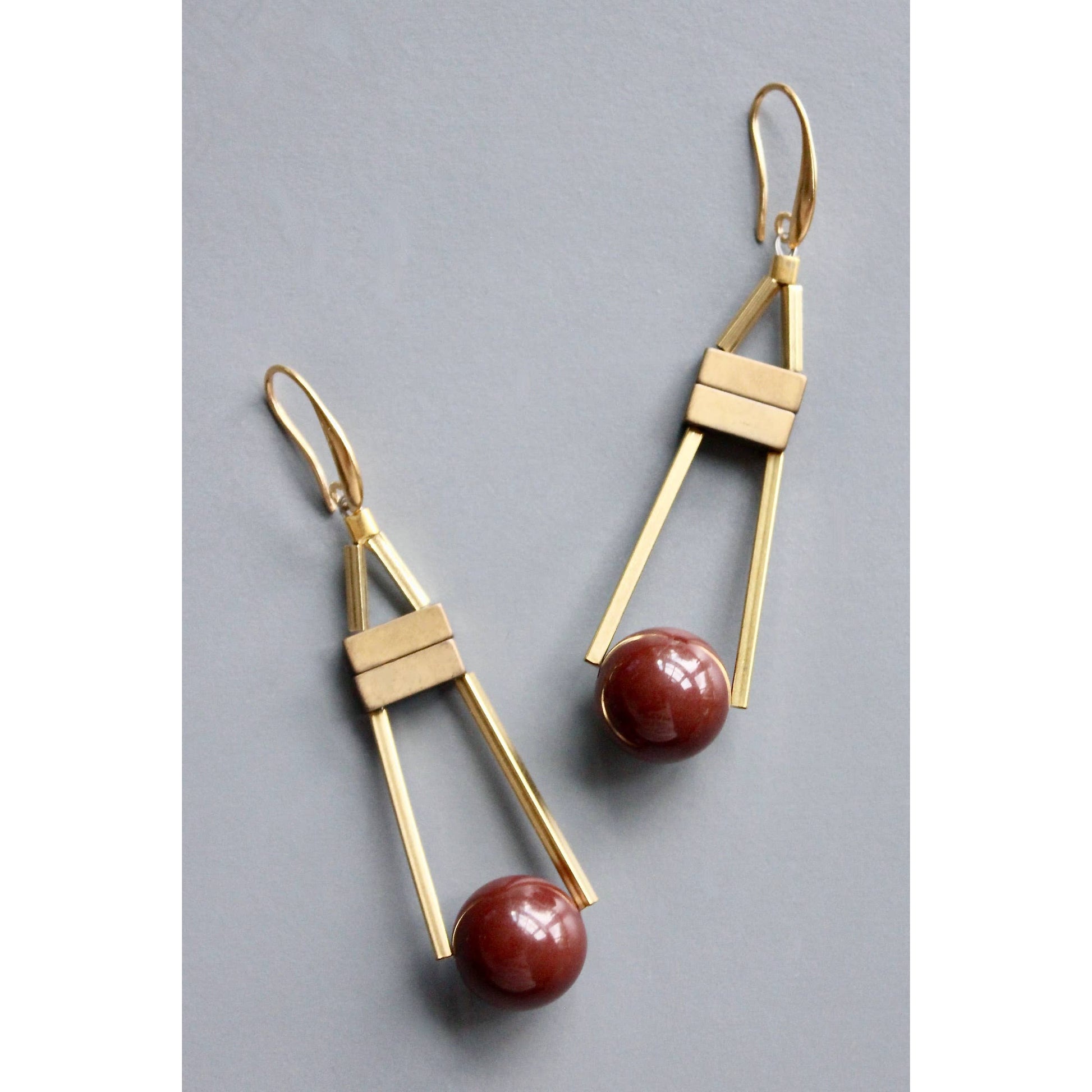 18k gold plated brass hooks with chocolate acrylic baubles and plated hematite. Each half pair weighs .22 oz and measures 3.125 inches