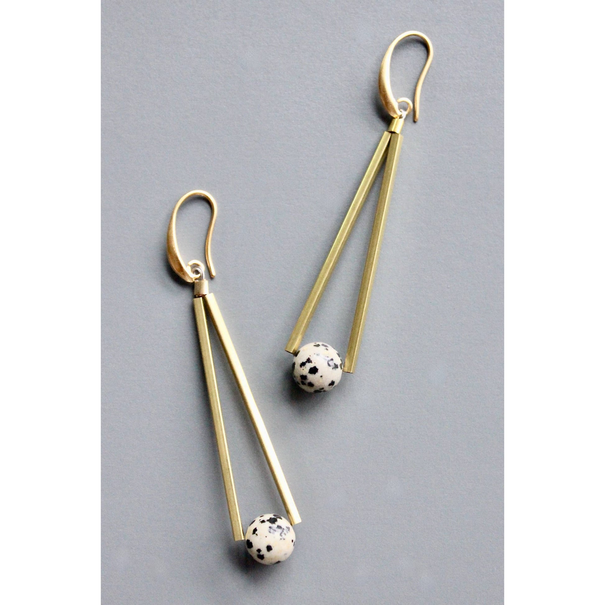 18k gold plated brass hooks with dalmatian jasper and brass. Each half pair weighs ..1 oz and measures 3.125 inches