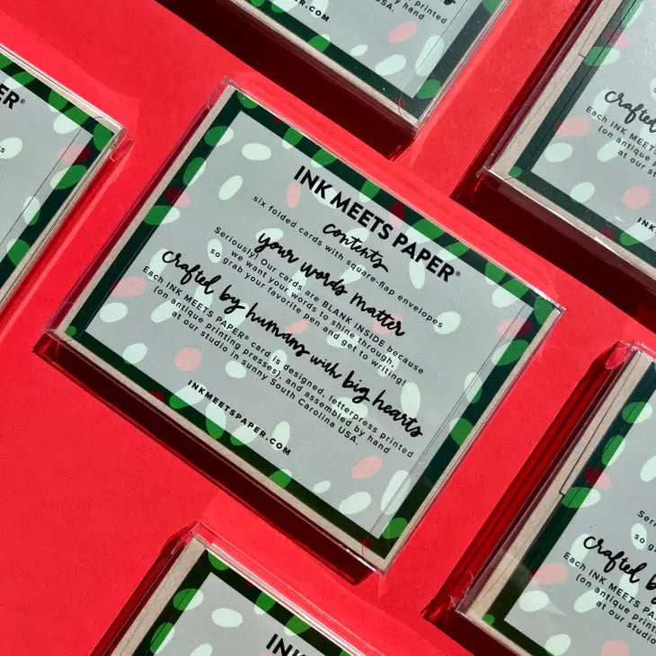 A2 boxed set of six folded greeting cards of the same style. Cards are blank inside. Paired with six square flap envelopes and packaged in a clear box with paper backer. All INK MEETS PAPER goods are designed, letterpress printed on antique machines (one color at a time!), and assembled by hand at our studio in sunny South Carolina, USA.