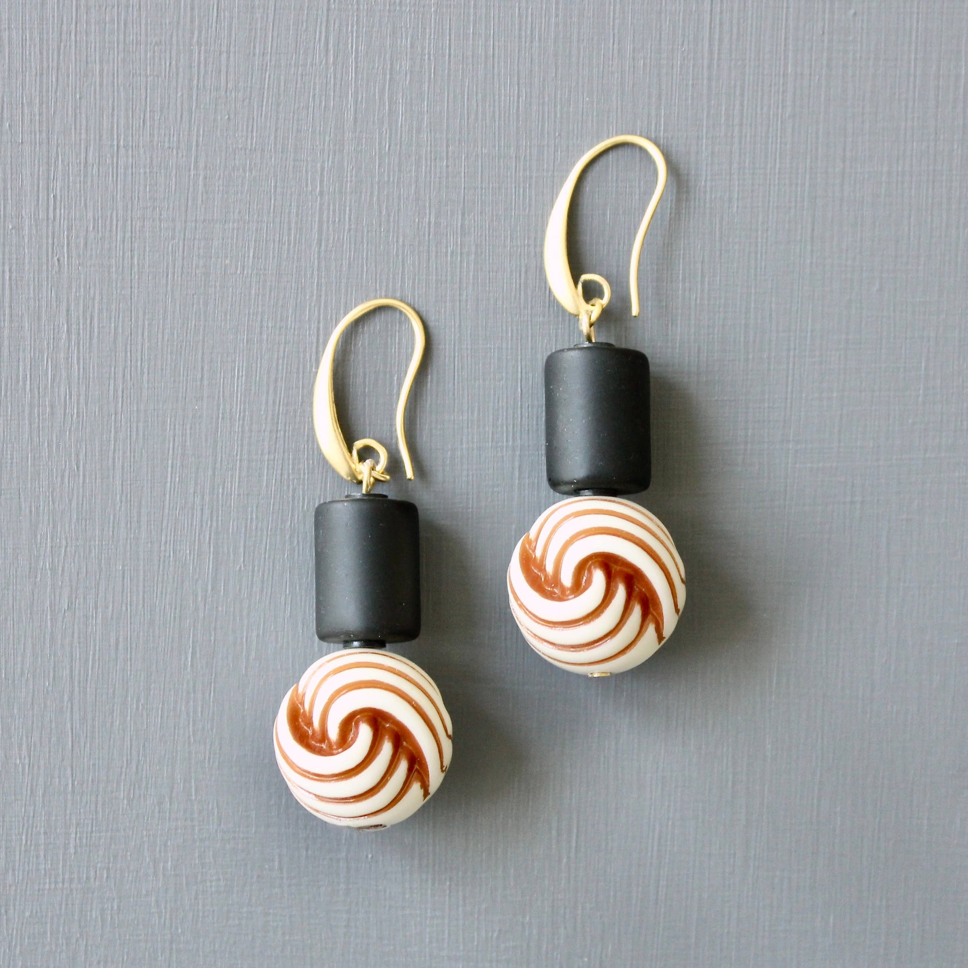 18k Gold plated brass hooks with black glass and vintage swirl acrylic beads. Each earring weighs .23 oz. and measures 2.25 inches in length from top to bottom.