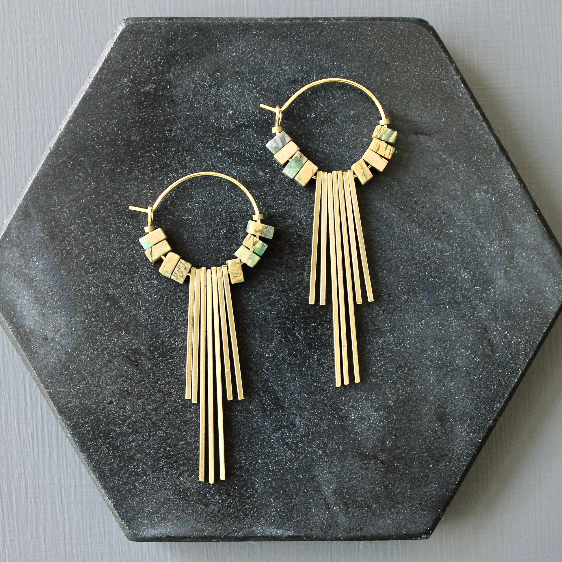 18k Gold plated brass hoop earrings with synthetic jasper chips and brass. Each earring weighs .165 oz. and measures 2.375 inches in length from top to bottom.