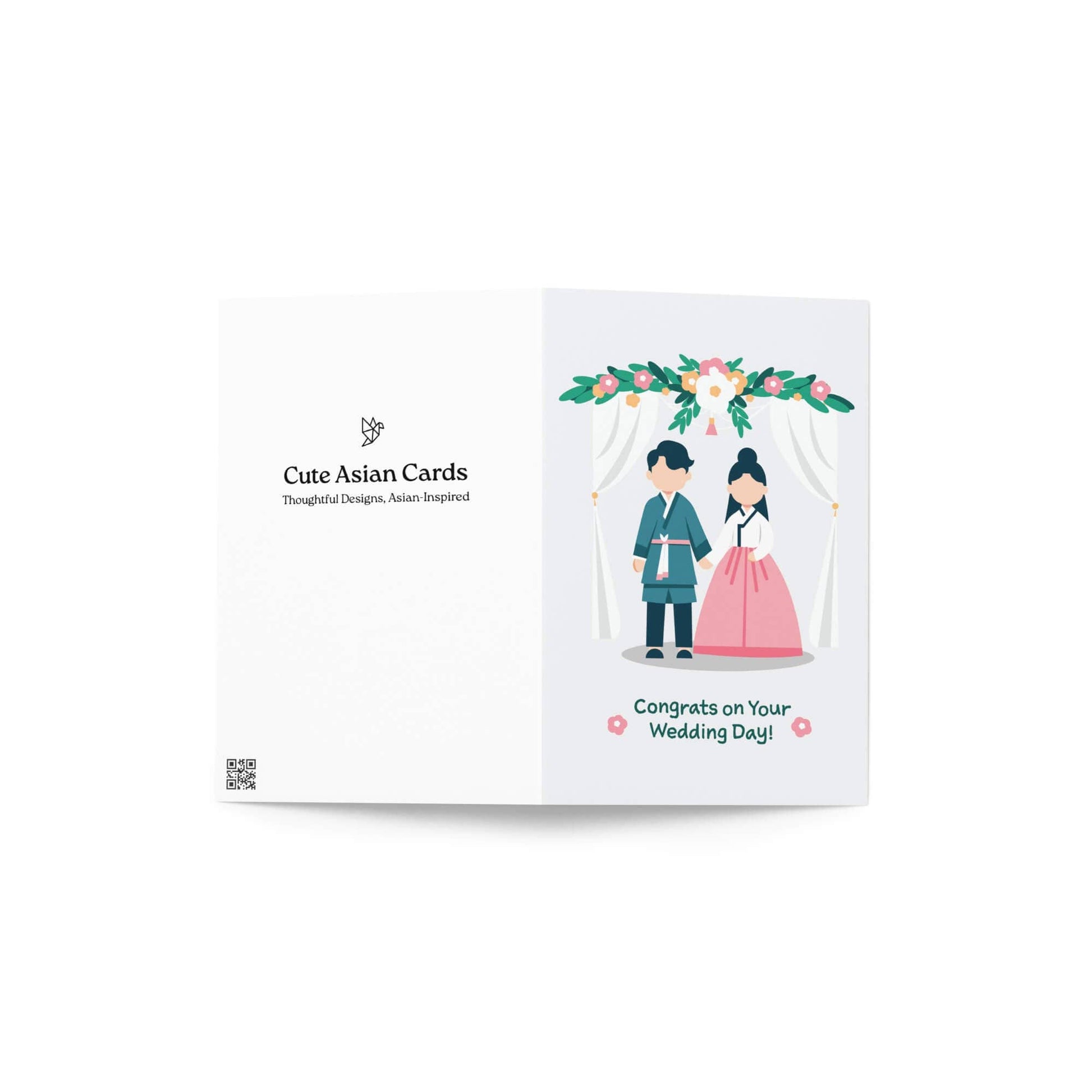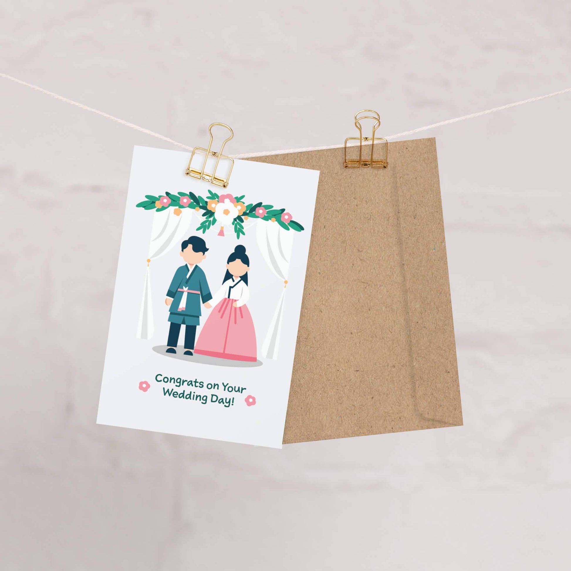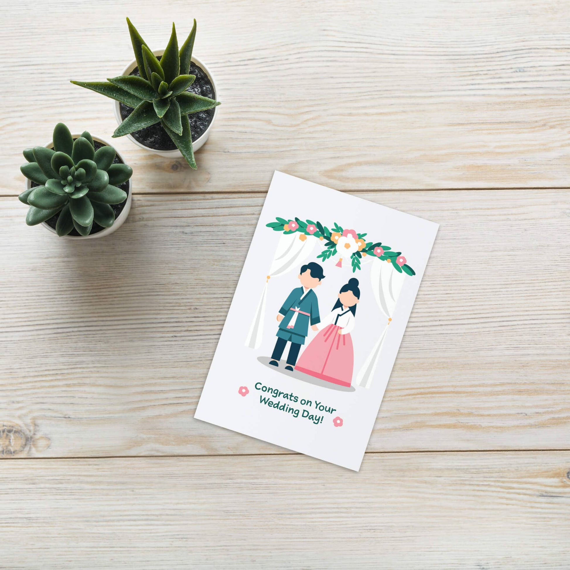 This adorable card features a sweet Korean couple dressed in traditional hanbok beneath a floral arch, dressed in traditional attire with soft pastel accents. It’s heartfelt, cheerful, and full of charm.