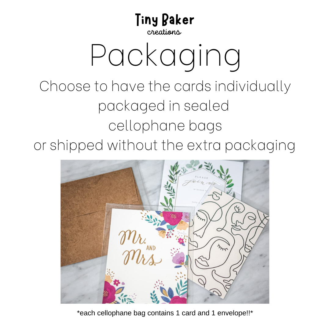 Choose to have them individually packaged in a sealed cellophane bag (both card and envelope packaged together), or shipped without the packaging.
