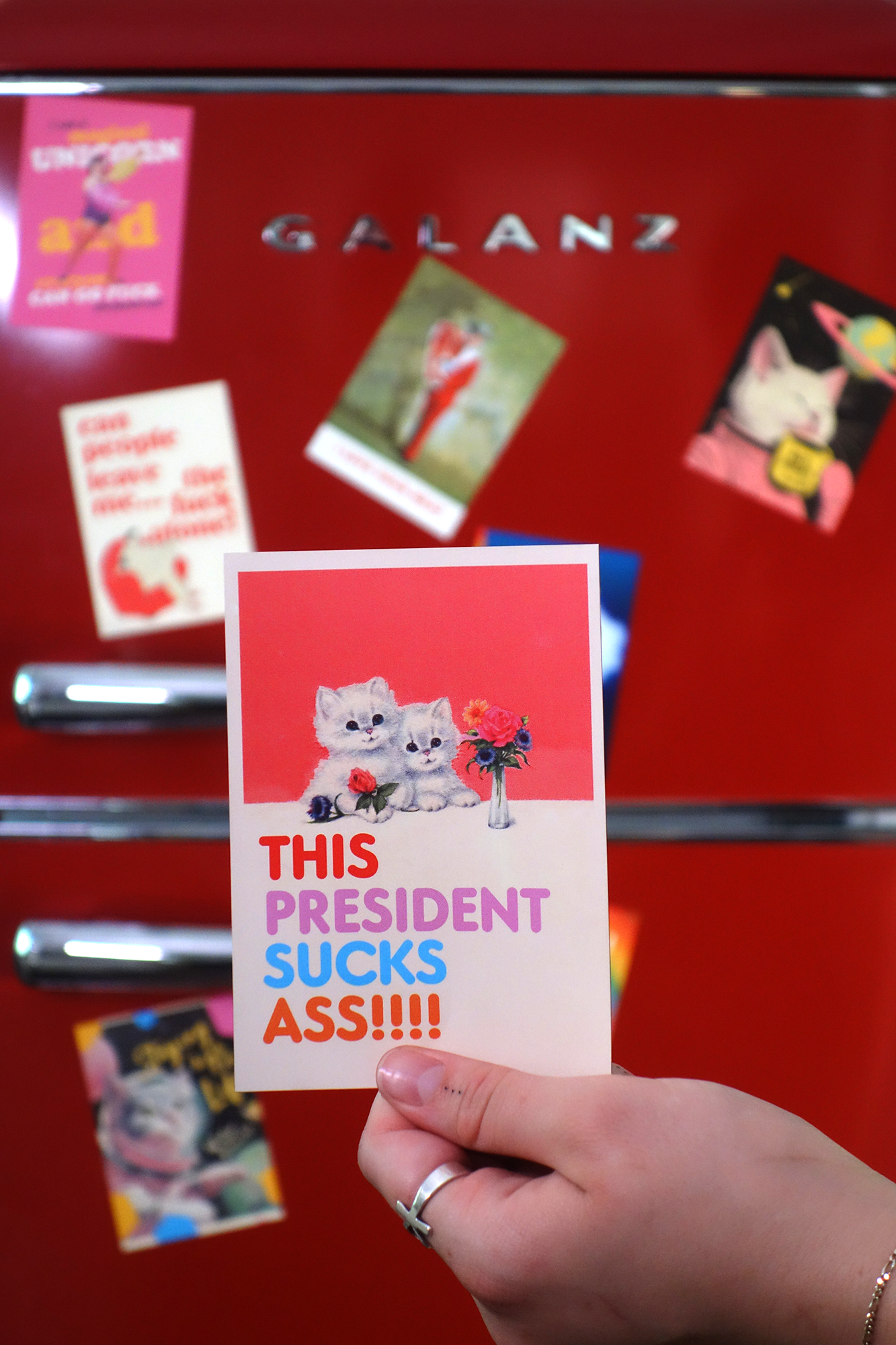 Our soft magnets are the fucking shit! These badass little bitches are super fun to put in your store for shits and giggles but hopefully for some serious sales as well! Wether for politics or cat lovers, we stand behind these designs 100%. Hopefully they are funny enough to make your customers wet themselves. These vinyl magnets will attach to anything metal. The durable vinyl is great for sunshine or rain so you can literally put them anywhere, on a fridge, on a car, or a stupid rocket! Size 3.5” x 5”. Guaranteed.