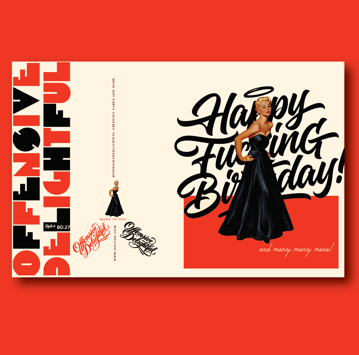 "Happy Fucking Birthday, and many many more!" Style No. BD23 funny birthday card, 1950's, evening wear, women, ladies, adult, edgy, cool birthday, sexy, style, elegance, feminine
