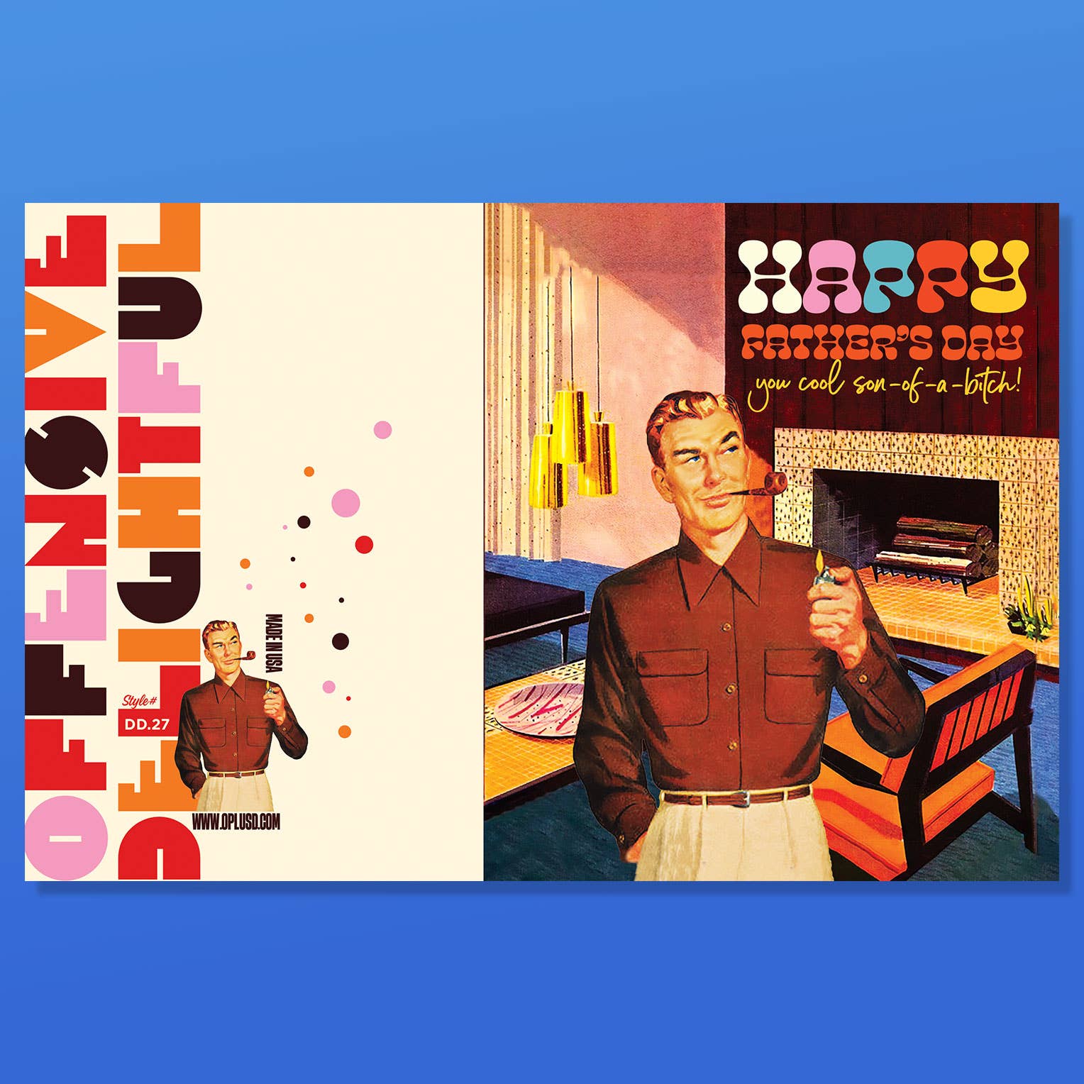 "Happy Father's Day you cool son-of-a-bitch!" How can you pass up a MIDCENTURY modern dad??? This card is a best seller, and dads love it. Father's Day, dads, pops, smoking, pipe, fireplace, furniture, cool as hell.