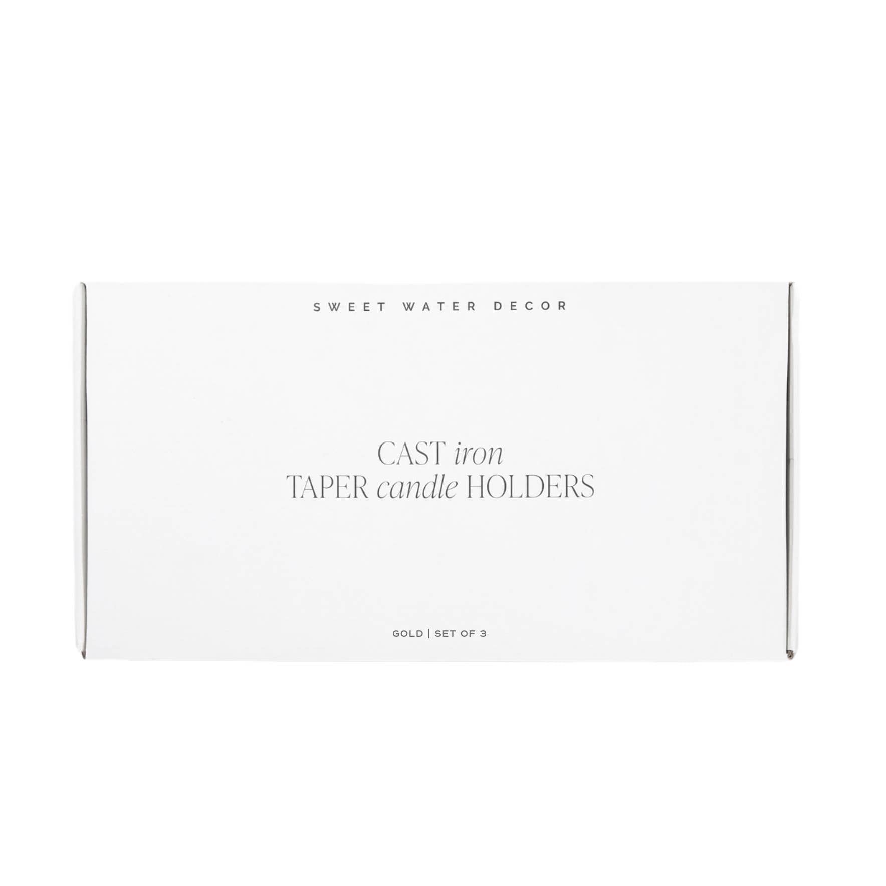 Our cast iron taper candlestick holders blend timeless design and durability, perfect for year-round styling or for Fall, Autumn. Pair with our fluted taper candles! ITEM DETAILS: • Cast Iron • Gold • Dimensions: Small: 3.35" x 12" Medium: 3.35" x 14" Large: 3.35" x 15.5" • Candles not included • Package Dimensions: 17.25" x 5" x 5" • Designed in the USA, Imported • Style No. CH002 ITEM CARE: • Dust with soft, lint-free, dry cloth • Melted wax can be gently scrubbed off • It is not recommended to use harsh household chemicals on product as this will tarnish the finish • Designed for interior use only TO USE: • Candle will be hot to the touch. Do not touch until cool • Burn candle within sight. Never burn candle on or near anything flammable • Keep out of reach of children and pets • Ensure holders are placed on a heat-resistant surface • Always leave at least 6" (15 cm) between burning candles • Recommended self-fit tapered candles size: 1" in diameter, up to 10" tall