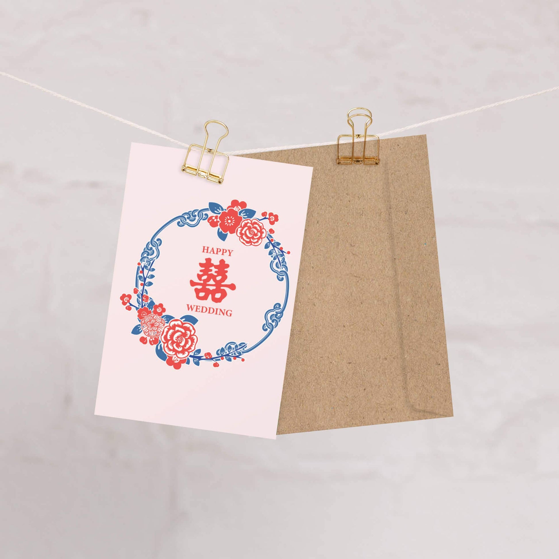 This card features the iconic double happiness character surrounded by a beautiful floral wreath in red and blue—a meaningful blend of tradition and elegance.