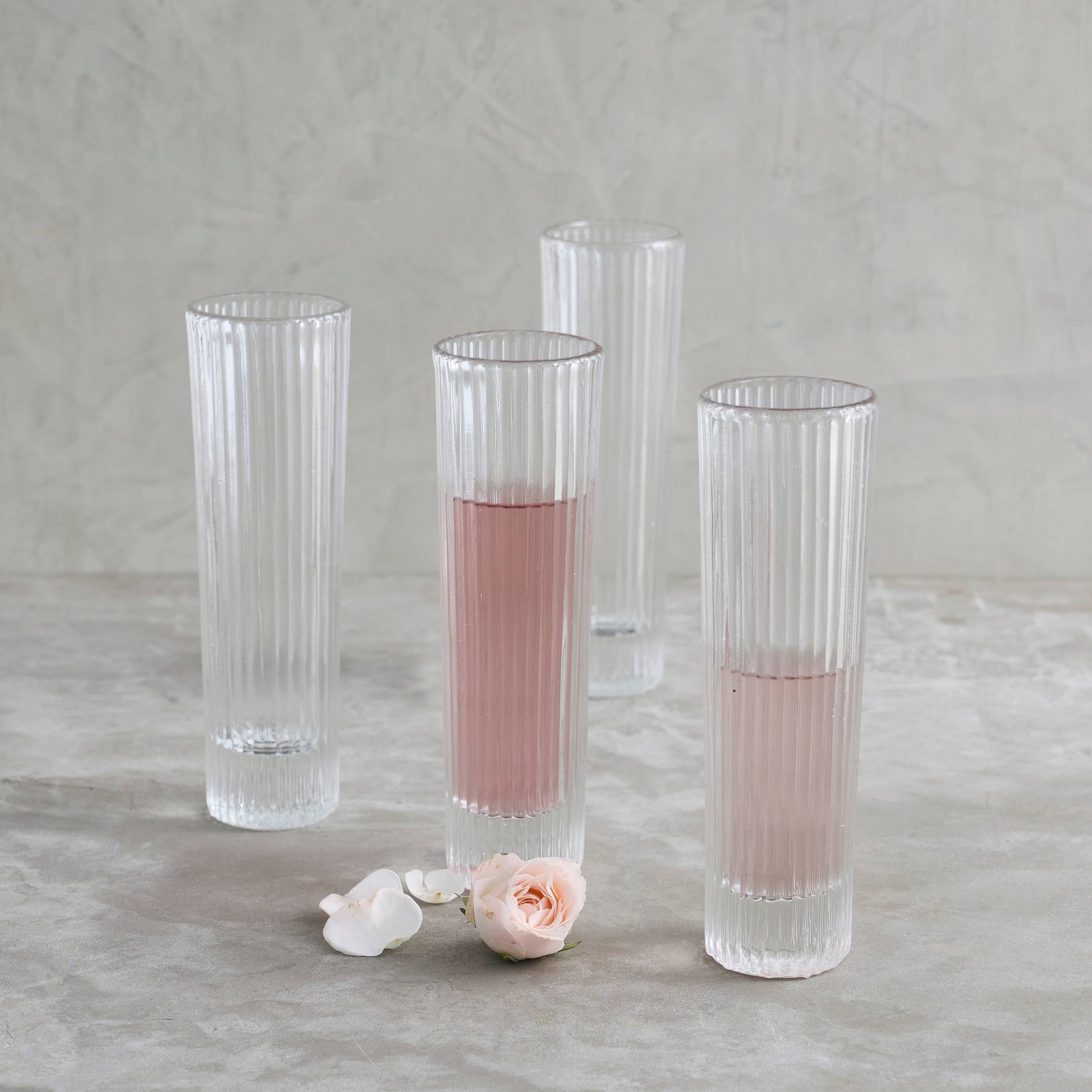 Bubbly never looked so good as it does in this columnar flute. Pressed glass features vertical ribs for visual interest and a secure grip. A hefty base ensures your glass remains upright and ready for a refill. Set of 4.
