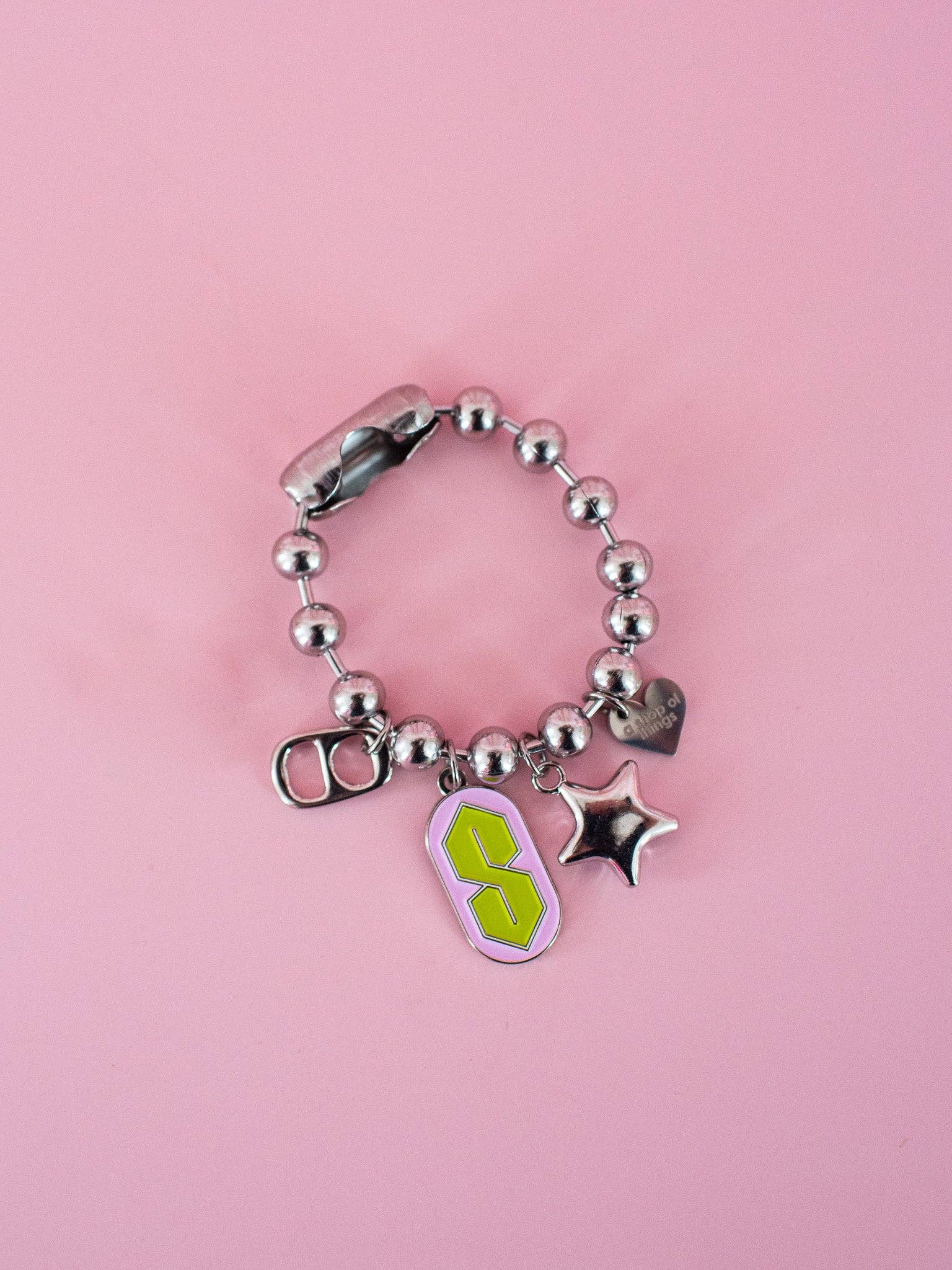 This cup charm is made from a silver toned oversized ball chain and has a soda tab, "S", star, and heart charm attached.