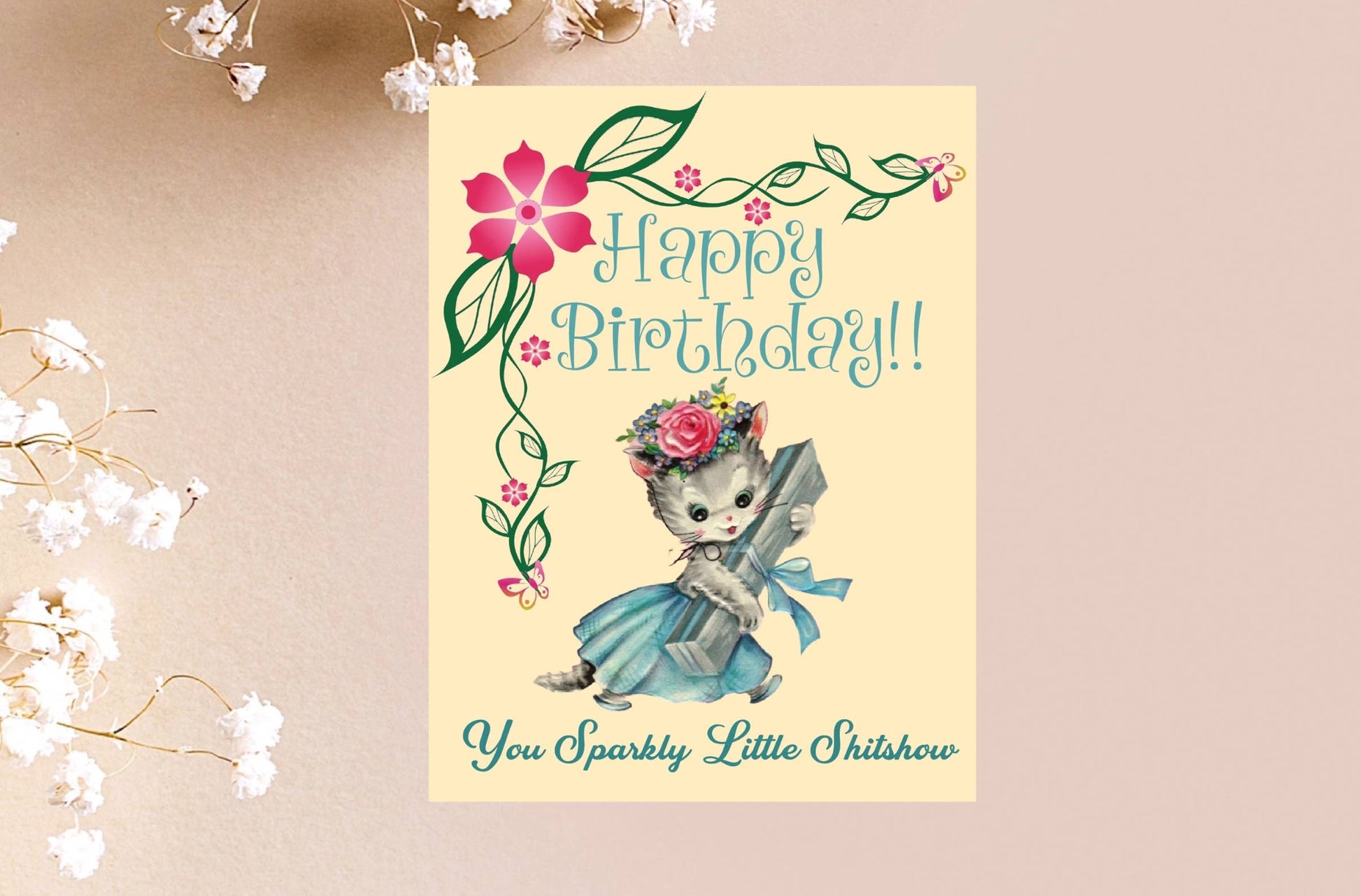 Thick, velvety cardstock + eye-popping color = a card that feels as outrageous as it reads. Comes with its own envelope (duh) and a plastic sleeve so it arrives looking fresh—no bent corners, no dull punchlines.