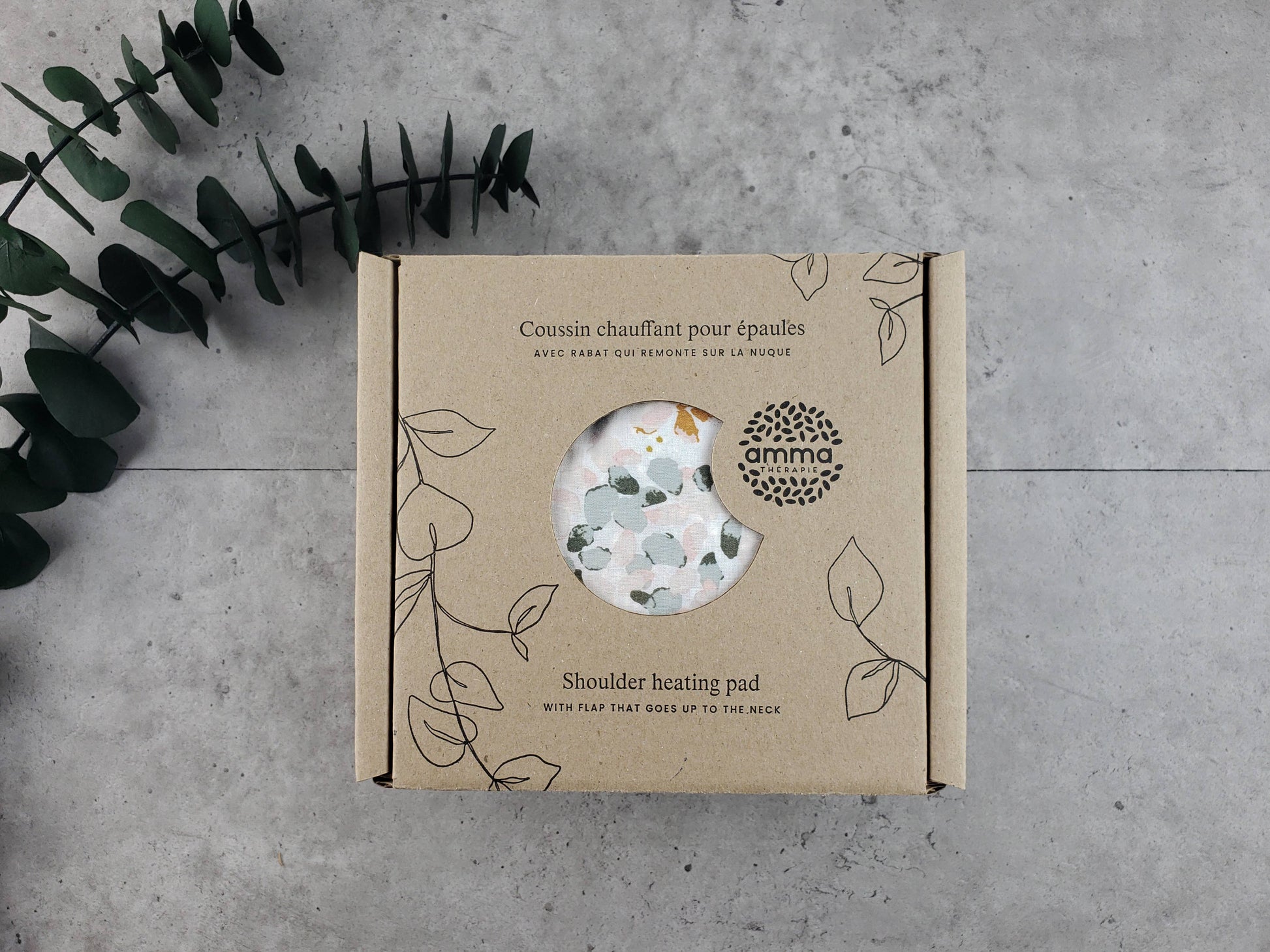 The Amma Therapie shoulder heating pad perfectly hugs the shoulders and neck. The middle part of the heating pad goes up to the neck to relax the muscles at the base of the skull. The weight of the compress immediately relaxes the shoulders and holds perfectly in place, even while you are standing. The heat relieves tense shoulders, stress, neck pain, torticollis (stiff neck) and also prevents migraines.