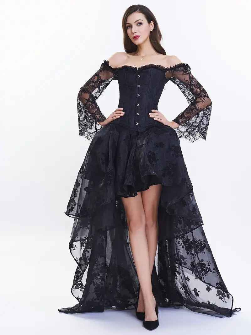Punk Corset Dress Set, Off Shoulder Lace Court Bustier Tops & Low Skirt, Halloween Costumes Party Wear, Women's Lingerie & Shapewear